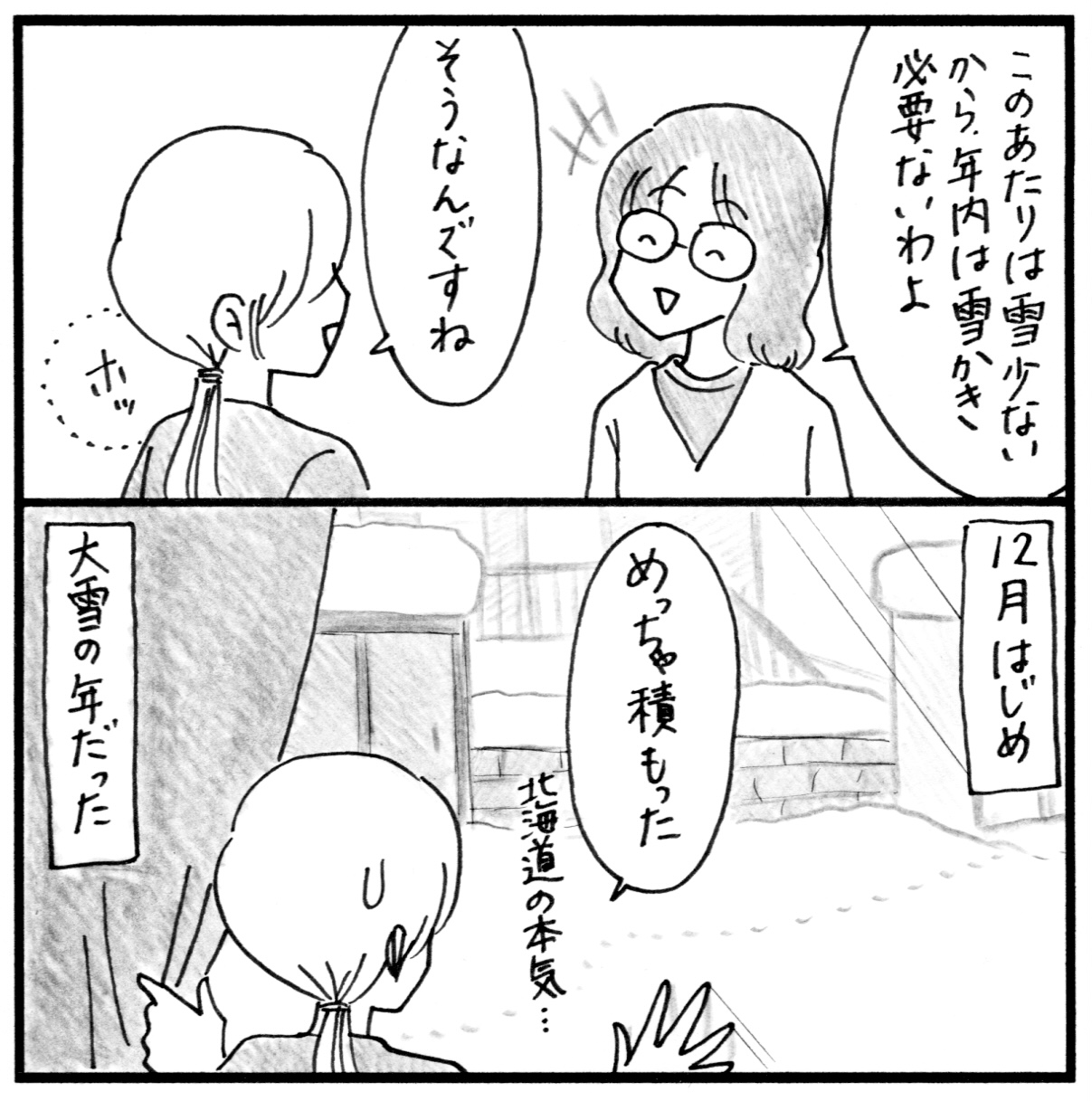 北海道移住物語 15 2022年01月14日 難聴、発達障害(知的障害)、睡眠障害、摂食障害、体幹機能障害のある息子カムを連れて東京から北海道へ移住したお話 雪国と言ったら雪かきですよね!ちなみに前回の漫画で北海道について学んでいるコマで出てきた、『ママさんダンプ』とは雪かきアイテムのことです。(2コマ目の奥で雪かきしている人が使っているのがママさんダンプです)お隣さんは親切でいろいろ細かく教えてくれました。本当にありがたい!しかし、初めての冬が大雪の年でいきなり結構な雪が積もってしまいました。北海道の冬を無事に生きていけるのか!? 次回に続く▼続きはこちら▼ ▽最初から読む▽ ***** 「思い出漫画」カテゴリの最新記事 タグ :#育児記録#発達障害#聴覚障害#障害児育児#育児漫画#コミックエッセイ#漫画#北海道移住 < 前の記事次の記事 > コメント コメント一覧 (4) 1. 櫛田千春 2022年01月14日 20:45 『ママさんダンプ』とりあえず覚えました😆 お隣が良い方で よかったですね💮雪かき❗不安でいっぱいですが やるしかないですね😣カム君は 初めての雪はどんな反応だったのかしら? 0 しおり がしました 2. shiori 2022年01月14日 21:38 >>1 もう本当にお隣さんにはたくさん助けてもらったんですよー!雪かき、腰を痛めないかビクビクしながらやりました😂 0 しおり がしました 3. Yoko 2022年01月15日 08:57 新天地への移住や転職…。 人生の転機ってありますよね〜😌 きっかけは色々あるけれど〜。 なんだか、しおりさんのブログをみて通勤時にちょっと清々しい気持ちになりました🍀 私も何かちょっとだけ頑張ろうかな〜☺️ 0 しおり がしました 4. shiori 2022年01月17日 22:58 >>3 新しいことってストレスもあるけど、新しい発見もたくさんあって、凄く楽しいですよ!楽しいと思えば楽しい方向に流れていく気がします✨ 0 しおり がしました このブログにコメントするにはログインが必要です。 さんログアウト この記事には許可ユーザしかコメントができません。 コメントフォーム 名前 コメント 記事の評価 リセット リセット 顔 星 情報を記憶 コメントを投稿する