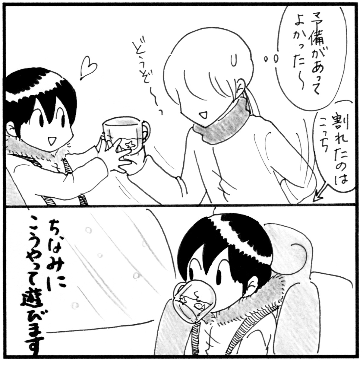 北海道移住物語 17 2022年01月17日 難聴、発達障害(知的障害)、睡眠障害、摂食障害、体幹機能障害のある息子カムを連れて東京から北海道へ移住したお話 このコートのファーを舐めちゃうんです^^;持ち歩き用おもちゃと車の中に積んでおく用おもちゃがあったのですが、車の中に入れておいたフェリーで買ったコップが凍結して破れました。(合計3つ買ったので助かりました〜) かなり気温下がるのでそりゃ凍るよね…。ウェットティッシュもカチコチに凍ってました〜。 次回に続く▼続きはこちら▼ ▽最初から読む▽ ***** 「思い出漫画」カテゴリの最新記事 タグ :#育児記録#発達障害#聴覚障害#障害児育児#育児漫画#コミックエッセイ#漫画#北海道移住 < 前の記事次の記事 > コメント コメント一覧 (6) 1. Yoko 2022年01月17日 20:59 やはり毛並みをそろえているに違いない…(暇つぶし?) 0 しおり がしました 3. shiori 2022年01月17日 23:05 >>1 風紀委員だから!身だしなみは整えないとね! 0 しおり がしました 2. 櫛田千春 2022年01月17日 21:38 にゃんこカム君がペロペロしてたファーの正体がわかって 嬉しい🎵😍🎵そうそう😃💡プラスチックのこうゆうコップって 熱いもの入れてても ヒビが入って使えなくなるんですよね😅3個買ってた しおりさんは偉い👏雪の壁はしばらく消えそうにありませんね😓これだけ 雪かきしたのかと思うと 大変さが よくわかります😨 0 しおり がしました 4. shiori 2022年01月17日 23:06 >>2 凍るのは当たり前なのに、すっかり忘れてました😅沢山買っておいて良かったー! 0 しおり がしました 5. りぃこ 2022年01月19日 07:51 インスタからこんにちは☆ カムちゃんのコート、なんか見た事あるなーって思ってよく見たら私が働いてたお店のブランドのでしたー!なんか嬉しくなったのでコメントしちゃいました(ノ≧ڡ≦)☆ 0 しおり がしました 6. shiori 2022年01月21日 20:44 >>5 えー!!!なんと!そうでしたか!カムちゃん、このコートをかっこよく着こなしていましたよ(親バカ) 0 しおり がしました このブログにコメントするにはログインが必要です。 さんログアウト この記事には許可ユーザしかコメントができません。 コメントフォーム 名前 コメント 記事の評価 リセット リセット 顔 星 情報を記憶 コメントを投稿する