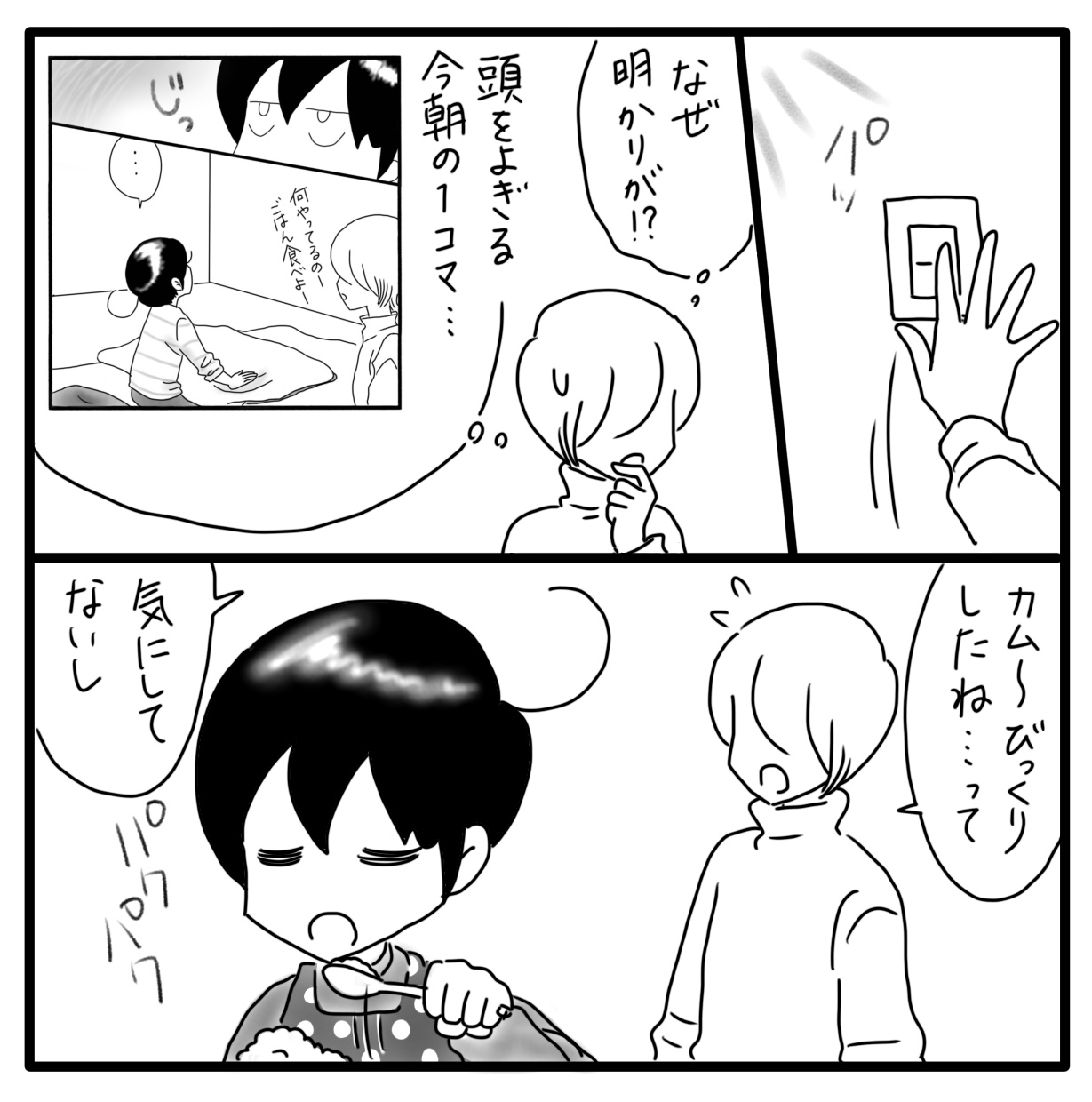 私とカムのある日の記録 10 2022年04月16日 明かりが消えた瞬間はカムもびっくりしたようで叫んでいたけど明るくなったら何事もなかったかのようにぱくぱくご飯を食べていました。平和でした。さて、問題のG…どうやら違う虫さんでした。よかった〜。あれ?なんで動いていたの?? そして…なぜ明かりが消えた??次回は謎の解明! お話は続きますが次回は一旦、日常漫画に戻ります。 ▼続きを読む▼ ***** 「日常」カテゴリの最新記事 タグ :#漫画#育児漫画#育児記録#コミックエッセイ#障害児育児#発達障害#知的障害#日記 < 前の記事次の記事 > コメント コメント一覧 (4) 1. 櫛田千春 2022年04月16日 20:25 それは それで ミステリーですね😨 カム君が動じてないだけが 救いです😅やはり カム君だけに見える お友達が原因⁉️ なにが どうなってるのか 真相はいかに⁉️ 0 しおり がしました 3. Shiori 2022年04月16日 23:25 >>1 謎の現象が…これから私が現場検証をして、謎を解き明かします! 0 しおり がしました 2. おだかひさみ 2022年04月16日 20:33 投稿楽しみに待っています。昨日は、衝撃でした!そんなそんな、北海道にはGいないと信じてたのにいぃー、いつかGのいない北海道へ移住したい!と願っているので、信じたくないよ〜と思いつつ、、今日の投稿で、次の展開がまた楽しみになりました^_^ カムさんの、落ち着きっぷりが頼もしい! 0 しおり がしました 4. Shiori 2022年04月16日 23:28 >>2 私も、北海道にはいないと思っていたのに!って衝撃でした!が。やはり見間違い!?? もしくは別の虫が!??? 0 しおり がしました このブログにコメントするにはログインが必要です。 さんログアウト この記事には許可ユーザしかコメントができません。 コメントフォーム 名前 コメント 記事の評価 リセット リセット 顔 星 情報を記憶 コメントを投稿する