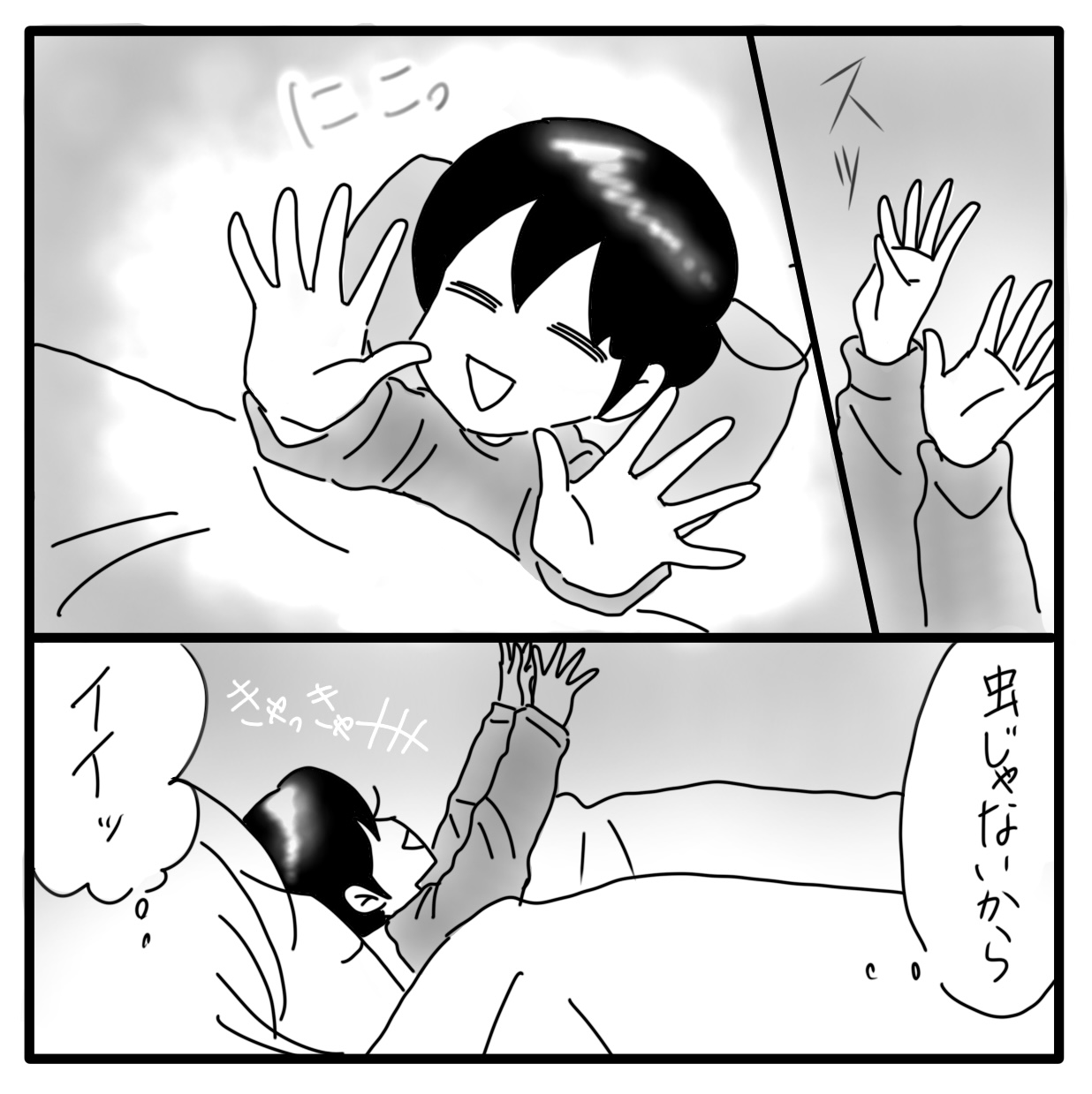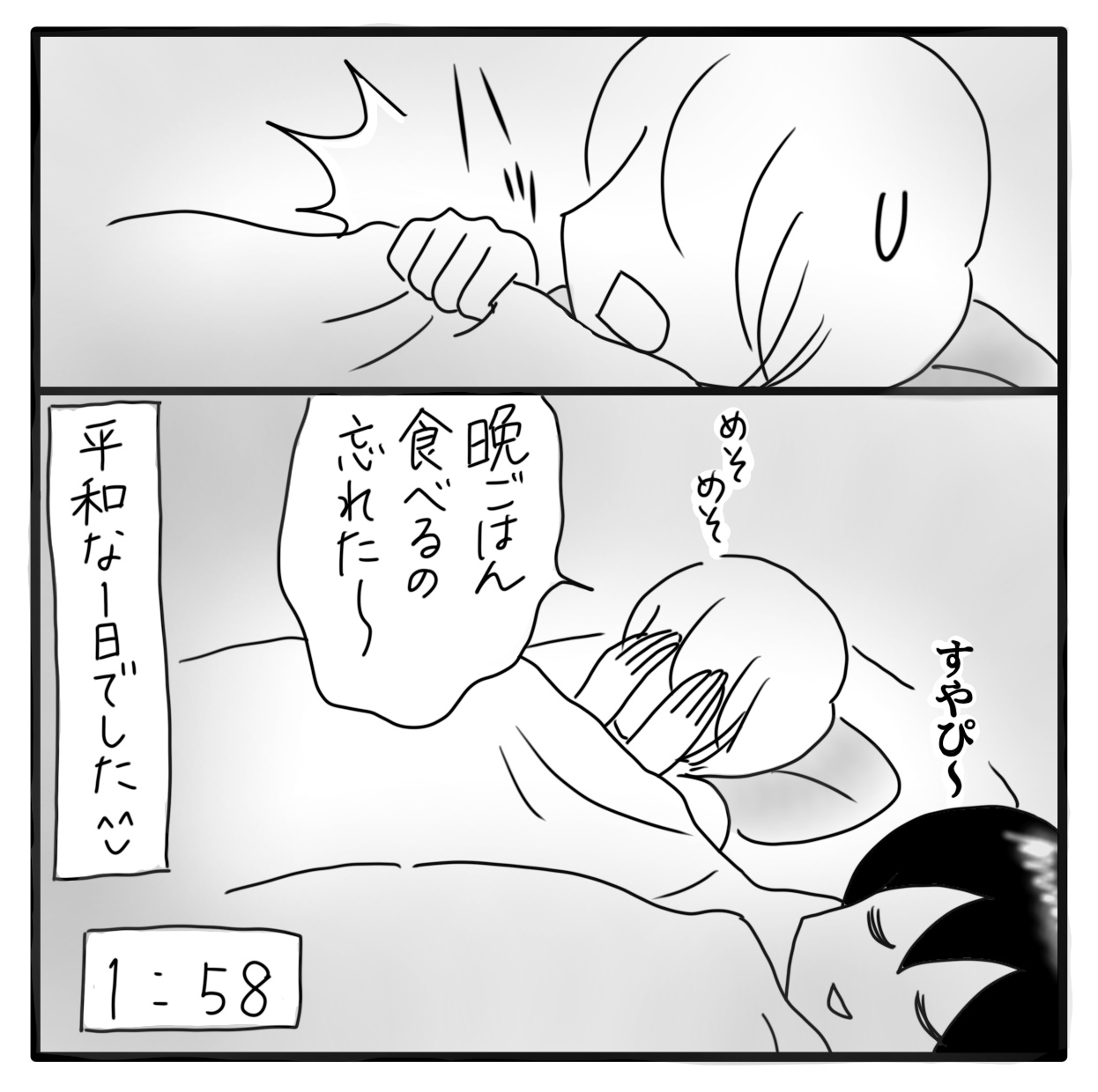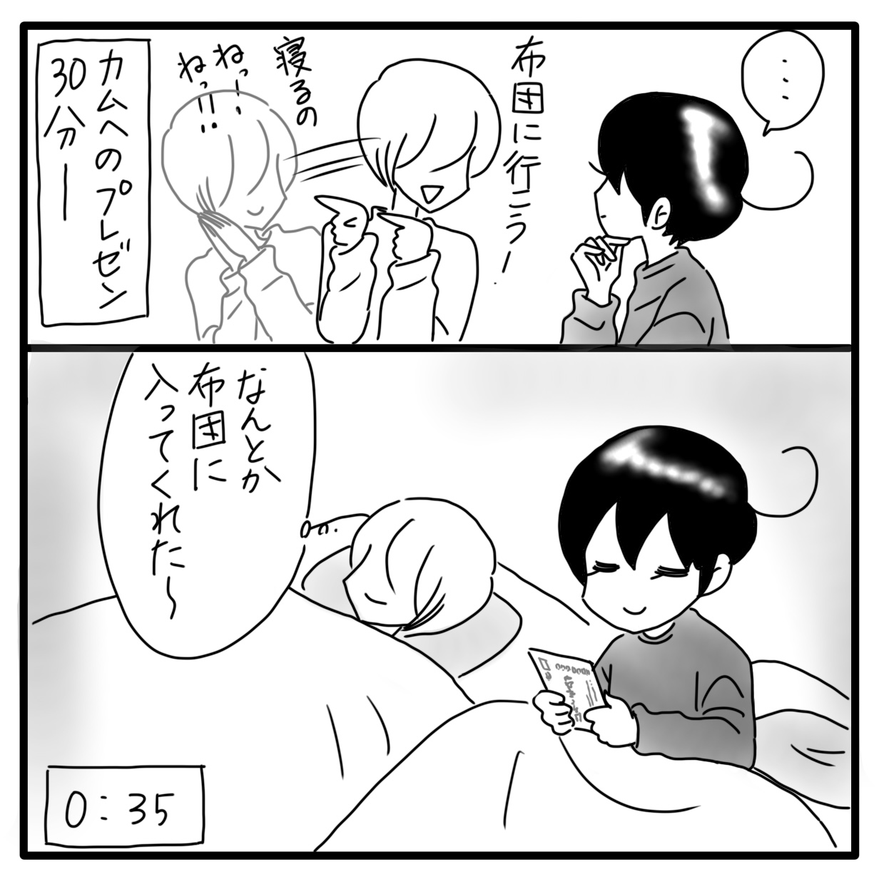 私とカムのある日の記録 13 2022年04月21日 おしまい今はちょっとカムが不安定でこんなにすんなり寝ないし、寝る時間は3時くらいです。やっぱり睡眠は気温が低い冬の方が安定しています。晩御飯を食べそこねることは結構多い笑まあ、それでも布団に入り、 眠りにつく瞬間が幸せです。明日も良い1日でありますように⭐︎ おしまいある日の記録にお付き合いくださりありがとうございます!次回からはカムの日常漫画です♪ ▽最初から読む▽ ***** 「日常」カテゴリの最新記事 タグ :#漫画#育児漫画#育児記録#コミックエッセイ#障害児育児#発達障害#知的障害#日記 < 前の記事次の記事 > コメント コメント一覧 (6) 1. Yoko 2022年04月22日 03:23 1日が無事に終わってお布団に入る幸せ💕人生そんな事の繰り返しですよね〜🙂 ハデなイベントなんかそうそうないですし 私は食いしん坊だから食かな🍖🍡🍣🍩 夕飯忘れるなんて😱ダメですよぉ それにしても、カムちゃんの宵っ張り❗️ 健在ですな😅 0 しおり がしました 4. Shiori 2022年04月23日 15:44 >>1 特に派手なことがなくても、お布団に入って幸せと思えるだけで幸せ💓夕飯は忘れちゃうことが多くて😅楽しみにしてるのに~~~😭 0 しおり がしました 2. ともすけ 2022年04月22日 06:15 カムちゃんは安定の可愛らしさ💕 そして「晩御飯食べ損ねた」のしおりさんがそれを上回って可愛い💕 長い一日ですね。 うちは9時までには寝てくれるけど日付が変わって1時ごろから4時半頃まで頻繁に起きてはしゃいで吸引して寝かしつけられて〜を繰り返します…。 私が布団に入るのが12時過ぎちゃうので結構しんどいです😢 0 しおり がしました 5. Shiori 2022年04月23日 15:49 >>2 睡眠は大事ですよね。まとまって寝ることができた時代が懐かしい😂 カムも夜中に起きることが多いです。お互い大変ですね😅 0 しおり がしました 3. なっちゃん 2022年04月22日 07:15 純粋なカム君ならではで、様々な方と会話しているのでしょうね☺️ 布団でハガキ見ているカム君の可愛いらしさにズキュン💘 それにしても、毎日毎日、カム君のリズム、そしてカム君が過ごしやすいように配慮しているしおりさんの様子も、更に時にはご自分の夕食食べ忘れまで・・・頑張りに頑張っているしおりさんに、本当~に脱帽です。 でも食事の食べ忘れ回数が減ることを願っています。そしてしおりさん自身が倒れませんように。 ほんの一部でしょうが、とても分かりやすく描かれた連載でした。心からお疲れさまです🙇♀️🍵 カム君としおりさんの様子が見られて、謎解きもあり、毎日更新を待ち望んでいたくらいでした。 そしてこれからも、カム君のペースでの成長と、出来れば早く反抗期から抜け出すことを願っています。 今後も応援しています😊💕 0 しおり がしました 6. Shiori 2022年04月23日 15:53 >>3 ハガキに気がついてくれて嬉しいです!カムは年賀状が大好き💓お気に入りの年賀状を見ています✨ 毎日大変だけど、カムに癒されたり振り回されたり。そんな日々が愛おしいです。 これからもカムの成長と日常を見守ってくださいね~! 0 しおり がしました このブログにコメントするにはログインが必要です。 さんログアウト この記事には許可ユーザしかコメントができません。 コメントフォーム 名前 コメント 記事の評価 リセット リセット 顔 星 情報を記憶 コメントを投稿する