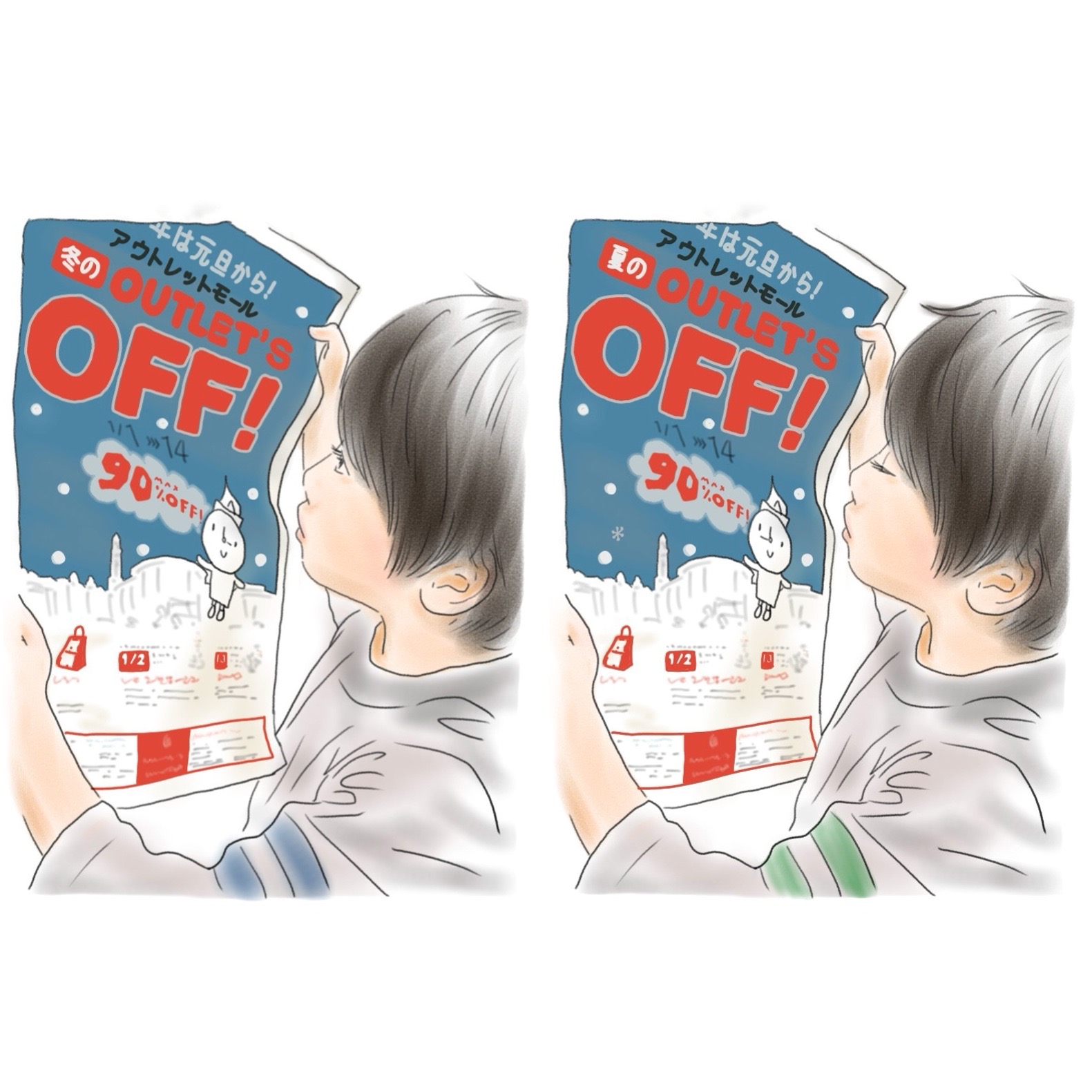 間違い探し!チラシを見るカム 2022年06月07日 これはカムが7歳の時の写真をもとに描いた絵です。次の2枚の絵、よく見ると間違いが7つあります。全部見つけられるかな?? 見つけられましたか?*ヒント*カムの間違いが3つチラシの間違いが4つ よーく見てみよう!*答え* いくつ見つけられましたか? たまにはこんな投稿もいいかななんて思って描いてみました。またやるよ!挑戦してね〜 ***** 「日常」カテゴリの最新記事 タグ :#漫画#育児漫画#育児記録#コミックエッセイ#障害児育児#発達障害#知的障害#子育て#間違い探し < 前の記事次の記事 > コメント コメント一覧 (2) 1. まる 2022年06月07日 20:48 チラシの端っこだけわからなかった!おしぃ〜 こういうのも楽しいですね☺︎また楽しみにしてます♡ 0 しおり がしました 2. Shiori 2022年06月07日 22:11 >>1 ちょっと難しかったですか?初めてなので難易度が分からず😅 次回もチャレンジしてくださいね! 0 しおり がしました このブログにコメントするにはログインが必要です。 さんログアウト この記事には許可ユーザしかコメントができません。 コメントフォーム 名前 コメント 記事の評価 リセット リセット 顔 星 情報を記憶 コメントを投稿する
