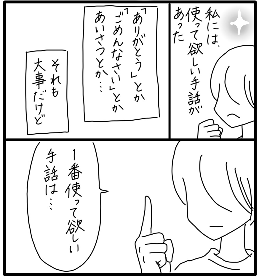 障害児カムのことばの話 18 2022年07月04日 ※ このお話はカムが小学生の頃の思い出漫画です。私には使って欲しい手話があった。一方的な願望なんですが。 ずっと前から『痛い』を使って欲しいって思っていたけどあることをきっかけにその思いは強まりました。次回に続く ▼続きを読む▼ ▽最初から読む▽ ***** 「日常」カテゴリの最新記事 タグ :#漫画#育児漫画#育児記録#コミックエッセイ#障害児育児#発達障害#知的障害#子育て#難聴#手話 < 前の記事次の記事 > コメント コメント一覧 (11) 1. 櫛田千春 2022年07月04日 19:48 今も 不安な 闇キャラ&アニ期な カム君は お元気でしょうか⁉️ 『痛い‼️』大事な手話ですよね💦 どうなるのか⁉️ 0 しおり がしました 6. Shiori 2022年07月05日 13:09 >>1 なかなかの不安定です😅『痛い』はどうしても使ってもらいたい手話!でも使う頻度が低い… 0 しおり がしました 2. Yoko 2022年07月04日 20:27 たし🦀🌬 ただ不機嫌なだけなのか、体の不調なのか区別がつかないと困りますよね😩💦 でも『痛い』はコレと教えるのは難しそう〜😥 0 しおり がしました 7. Shiori 2022年07月05日 13:11 >>2 そうなんですよ!特に病気で体調悪い時、発熱しないと気がつかないので…お腹痛いとか、頭痛いとか、何となくでも表現できたらいいんですけど 0 しおり がしました 3. みー 2022年07月04日 20:36 初めまして! カムちゃんの可愛い姿に癒されています✨ 子供と読んでいます! キリのいい所で毎回お話が終わるとありがたいのですが💦 続きが気になって、うぁーってなってしまうみたいです😵 そうもいきませんよね😂 0 しおり がしました 8. Shiori 2022年07月05日 13:14 >>3 そうですか!続きが気になってくれるのはとても嬉しいです💓 構成の都合で中途半端になってしまうことも😅ごめんなさい~~ 0 しおり がしました 11. みー 2022年07月06日 00:45 >>8 ありがとうございます✨ 娘の、うゎー!が毎回だと大変なので、私は投稿ごとに、娘はお話が完結してからまとめて見せる事にしました💗 親子ですっかりカムちゃんファンです😊 手話を使うカムちゃんも闇堕ちカムちゃんも全部かわいいです🥰 0 しおり がしました 4. ともすけ 2022年07月05日 06:20 わかる! 痛い。 どこが痛い。 これって本人が表現してくれないとわからないから。 0 しおり がしました 9. Shiori 2022年07月05日 13:16 >>4 親としては早期発見のためにも是非使ってもらいたい表現ですよね!大きな課題です。 子供は痛いと言うことを表現するのは難しい。知的障害のあるカムにどこまでできるか… 0 しおり がしました 5. saruzou 2022年07月05日 07:36 痛さにも色々あるし、どういう痛みなのかどこなのか自分でもわかりにくいこともありますしね…… なかなか難しい…… 0 しおり がしました 10. Shiori 2022年07月05日 13:17 >>5 痛みの表現は難しいですね。単に違和感を感じるだけの時もあるし😅そして痛いと表現して見せるタイミングも少なくて 0 しおり がしました このブログにコメントするにはログインが必要です。 さんログアウト この記事には許可ユーザしかコメントができません。 コメントフォーム 名前 コメント 記事の評価 リセット リセット 顔 星 情報を記憶 コメントを投稿する