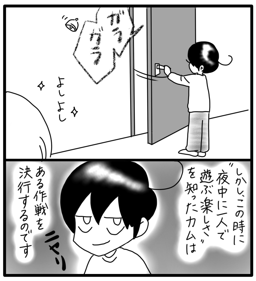 宵っ張りカムの傾向と対策 20 2022年09月19日 ※ 最重度の障害があり、睡眠障害のあるカムが小学生の頃のお話ですドアにベルをつけました。カムはドアを開ける時の力加減が上手ではないので、いい具合にガタガタ揺れてベルがうるさく鳴ってくれます。眠ってた熊鈴にも仕事してもらいました。(ベルがぶつかってドアが傷つかないようにシートを貼りました)しかし、一人で遊ぶ楽しさを知ったカム。カムがある行動に出ます。なんと次回はカムからの反撃のターンです笑お話は続きますが次回は一旦、日常漫画に戻ります。 ▼続きを読む▼ ▽最初から読む▽ ***** 「睡眠」カテゴリの最新記事 タグ :#漫画#育児漫画#育児記録#コミックエッセイ#障害児育児#発達障害#知的障害#子育て#睡眠障害 < 前の記事次の記事 > コメント コメント一覧 (6) 1. なっちゃん 2022年09月19日 19:42 確かに、知らない間に怪我や、最悪外へ出てしまったらと考えると、何とかせねば❗と思いますよね。 せっかく、しおりさんが素晴らしい案で対策したのに・・・。 さぁ~楽しさを知ったカム君は、どんな技を使ってくるのかな?答えが出るまで、いろいろ想像してみますが、想像を越えてくるのでしょうね😁 0 しおり がしました 4. Shiori 2022年09月22日 12:42 >>1 そうなんですよ!外に出る可能性は高く…怖いです💦カムの作戦、なかなかですよ〜! 0 しおり がしました 2. ななし 2022年09月19日 20:59 カムくんパパいたんですね笑 私が読みはじめてから初めてパパさん出てきました。 0 しおり がしました 5. Shiori 2022年09月22日 12:43 >>2 いたんですよ〜!今回は真夜中のお話が多いのであまり登場せず…。実はカムが採血するお話のところでこっそり登場しているんです😁 0 しおり がしました 3. Yoko 2022年09月20日 02:43 そ〜っと起きてそ〜っと悪さ(笑)されたらわかりませんよね💦 子供ってちゃんと理解してるのか、静かさに比例してイタズラ度UP‼️ カウベル🔔ならぬカムベル🔔😝と思ったけどベアベル🐻でしたね… 真夜中の親子の知恵比べやいかに🤤❣️ 0 しおり がしました 6. Shiori 2022年09月22日 12:45 >>3 真夜中の攻防戦😂さて、どちらが勝つか!? 0 しおり がしました このブログにコメントするにはログインが必要です。 さんログアウト この記事には許可ユーザしかコメントができません。 コメントフォーム 名前 コメント 記事の評価 リセット リセット 顔 星 情報を記憶 コメントを投稿する