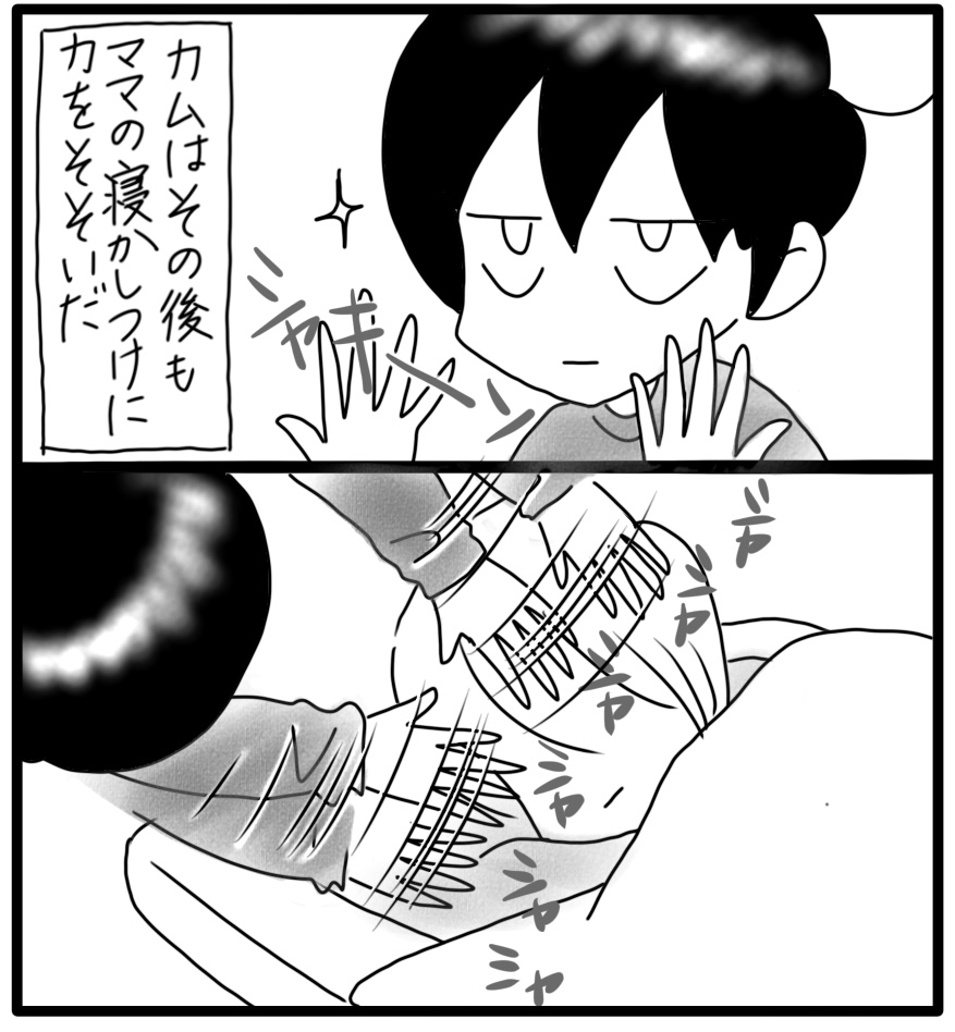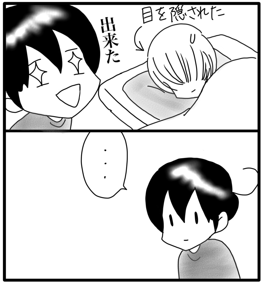 宵っ張りカムの傾向と対策 24 2022年09月26日 ※ 最重度の障害があり、睡眠障害のあるカムが小学生の頃のお話です。目を隠せば寝ると思ったのかな。もはや二人とも寝かしつける気が感じられません笑まだ続くよカムによる寝かしつけ作戦!!次回の寝かしつけ、ついにママにピンチが訪れる!!次回に続く ▼続きを読む▼ ▽最初から読む▽ ***** 「睡眠」カテゴリの最新記事 タグ :#漫画#育児漫画#育児記録#コミックエッセイ#障害児育児#発達障害#知的障害#子育て#睡眠障害 < 前の記事次の記事 > コメント コメント一覧 (8) 1. なっちゃん 2022年09月26日 20:15 昨日のお話しは、カム君優しい😭 そしてママのそばへおもちゃを持ってきて遊ぶ❗それ素晴らしい案だ✨と思っていたら、久々に見た風紀委員復活😂😂 今日のは、親子のやりとりに、声出して爆笑🤣🤣 さぁ~続きがどうなるのか‼️ 0 しおり がしました 5. Shiori 2022年10月02日 18:05 >>1 もはや二人とも寝かしつけを忘れています😂 まあ、楽しいからいいかな〜 0 しおり がしました 2. 櫛田千春 2022年09月26日 20:20 ギャハハハッ(≧▽≦)こちらも 思わず笑顔になります😂 カム君💕 しおりさんで遊んでる? されるがままの しおりさんも好きだわ💓♥️❤️ 眠ってくれないのは 心配だけれど カム君がたのしそうだから オールOK⁉️😅 0 しおり がしました 6. Shiori 2022年10月02日 18:06 >>2 寝かしつけなのか遊ばれているのか…微妙ですよね〜😂 0 しおり がしました 3. saruzou 2022年09月26日 21:49 しおりさん、お久しぶりです~。 カムくんとしおりさんの静かな闘い?を、ニヤニヤしながら読んでおります😁 最後の、前髪よけたら目、のしおりさんを見て 「あ、鬼太郎」 と、思ってしまいました(鬼太郎は右目だけど)😆 私は寝たフリ無理だわ~、絶対笑っちゃう😆 0 しおり がしました 7. Shiori 2022年10月02日 18:08 >>3 確かに鬼太郎!鬼太郎って目はどっちが見えていたっけ? 笑わずに寝たふりって大変ですよね〜😂 0 しおり がしました 4. kyakya 2022年09月27日 01:15 スミマセンスミマセン パッチリおめめに ワタシもカムくんみたく大爆笑でしたーー 0 しおり がしました 8. Shiori 2022年10月02日 18:09 >>4 力いっぱい開いてみました👀 0 しおり がしました このブログにコメントするにはログインが必要です。 さんログアウト この記事には許可ユーザしかコメントができません。 コメントフォーム 名前 コメント 記事の評価 リセット リセット 顔 星 情報を記憶 コメントを投稿する