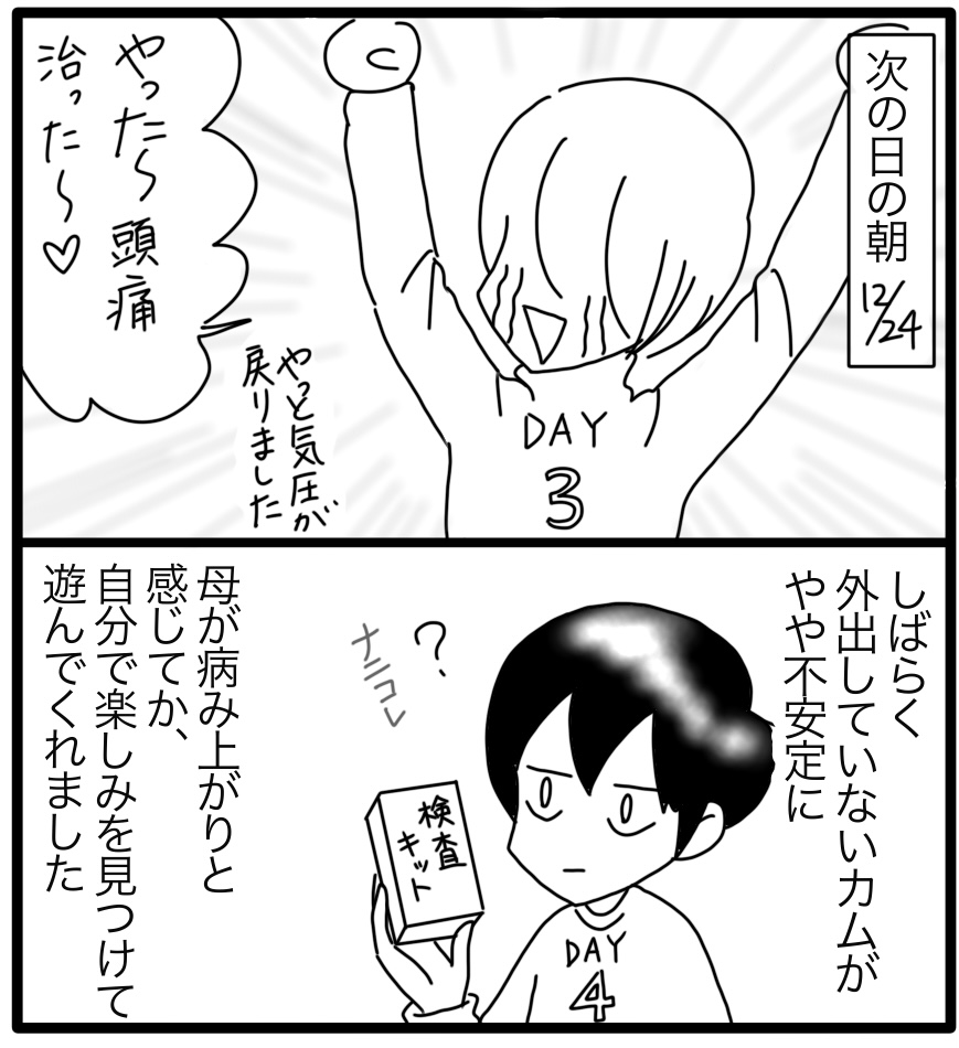家族でコロナになりまして 11 2023年01月11日 コロナの攻撃。それは驚くほどの乾燥。室内には沢山の洗濯物が干してあったし、湿度は低くはありませんでしたが、そんなんじゃダメだったみたい💦加湿(洗濯物追加)してオイル塗って寝ました。真夜中の喉の痛みも、濡れマスクで落ち着いたので喉が乾燥してたみたい。油断禁物ですね~。ちなみにカムはすっかり元気。若さが眩しい✨さて、今回我が家は病院には行きませんでした。そういう場合、陽性判定はどうなるのか?次回に続く▼続きを読む▼ ▽最初から読む▽ ***** 「日常」カテゴリの最新記事 タグ :#漫画#育児漫画#育児記録#コミックエッセイ#障害児育児#発達障害#知的障害#子育て#コロナ < 前の記事次の記事 > コメント コメント一覧 (2) 1. 櫛田千春 2023年01月11日 19:45 厳しい寒さに まだまだ緊張の日々ですね🌁⛄🌁 どうか ご家族皆様 もう何事もなく 春を迎えられますように🙏 逃げるカム君💕石を愛でるカム君💕 大きくなりつつも かわいい~💓♥️❤️ 0 しおり がしました 2. Shiori 2023年01月16日 17:50 >>1 本当ですね!寒さは続きますが、元気に過ごしたいです! 0 しおり がしました このブログにコメントするにはログインが必要です。 さんログアウト この記事には許可ユーザしかコメントができません。 コメントフォーム 名前 コメント 記事の評価 リセット リセット 顔 星 情報を記憶 コメントを投稿する