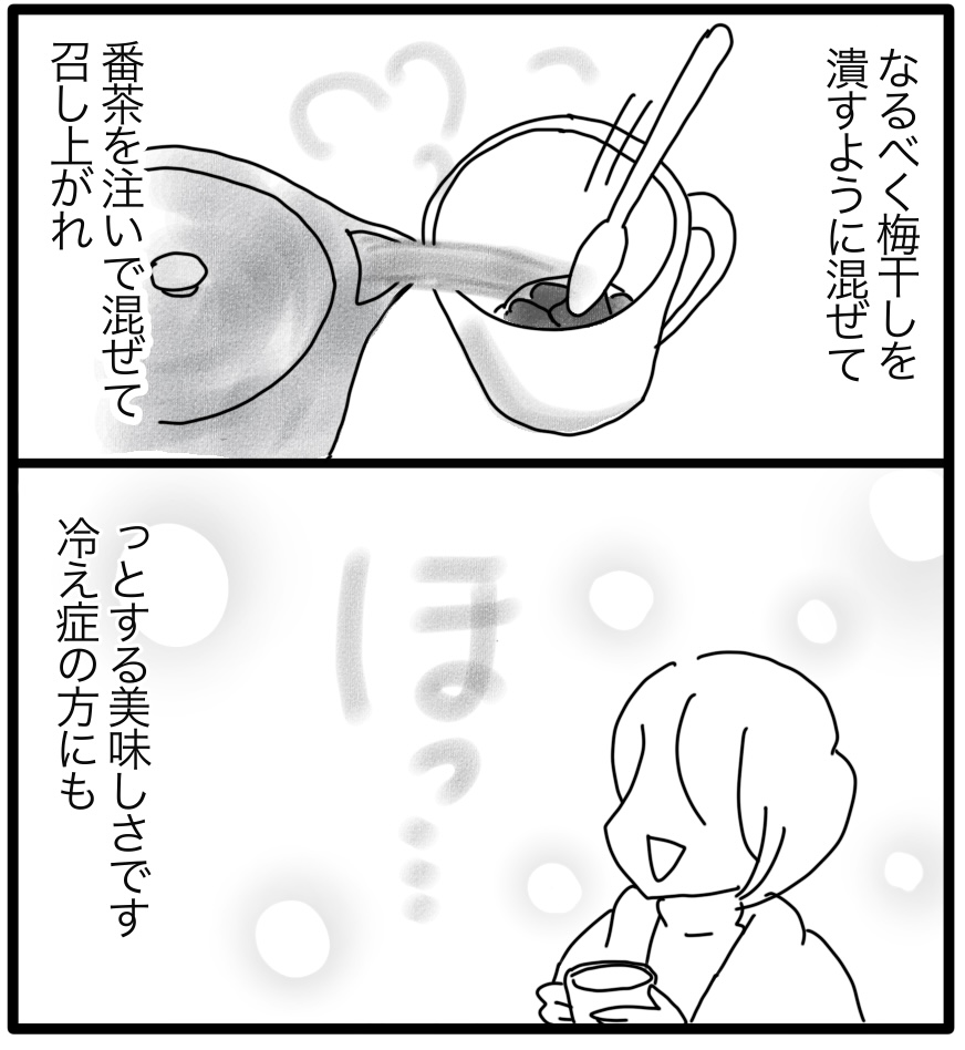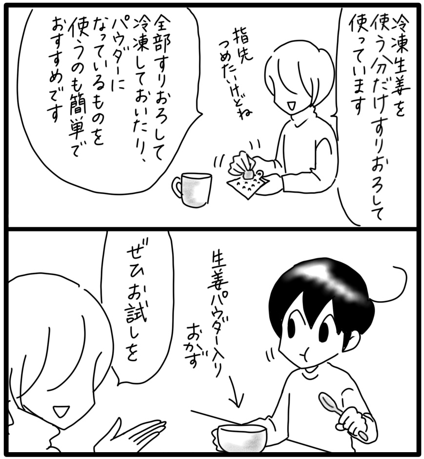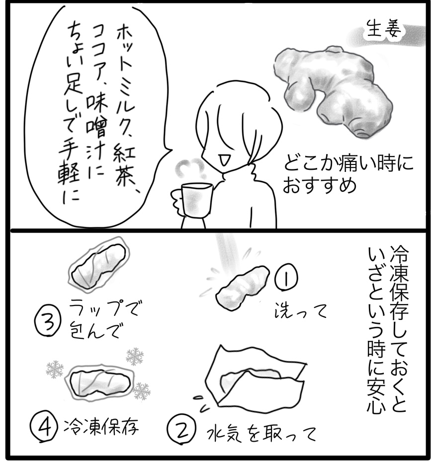 家族でコロナになりまして 16 2023年01月19日 体調が悪い時のおすすめレシピ第二弾でした。我が家では、体調を崩しやすい冬には生姜、梅干し、はちみつ(マヌカ)は常備。生姜は皮ごと使いたいので無農薬のものを買って、冷凍したり、乾燥させて粉末にして保存しています。身体が温まるので風邪予防にも! この連載を公開している間に我が家もコロナになりました…と報告が増えてきました。インフルエンザも増えているようです。寒いし乾燥しているし…。ウイルス活発ですね(~_~;)みんな生姜であったまろう!次回に続く▼続きを読む▼ ▽最初から読む▽ ***** 「日常」カテゴリの最新記事 タグ :#漫画#育児漫画#育児記録#コミックエッセイ#障害児育児#発達障害#知的障害#子育て#コロナ < 前の記事次の記事 > コメント このブログにコメントするにはログインが必要です。 さんログアウト この記事には許可ユーザしかコメントができません。 コメントフォーム 名前 コメント 記事の評価 リセット リセット 顔 星 情報を記憶 コメントを投稿する
