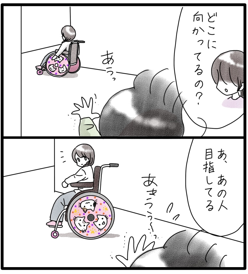 カムは車椅子の模様に夢中。