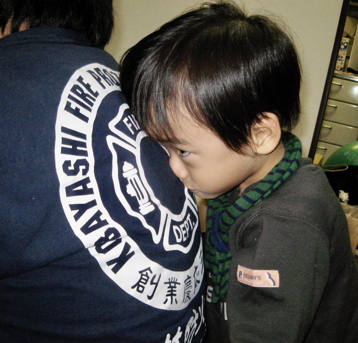 パパの背中で変顔してます。