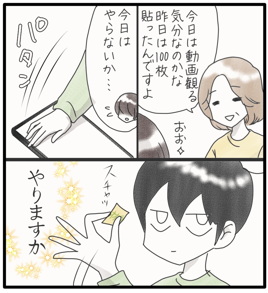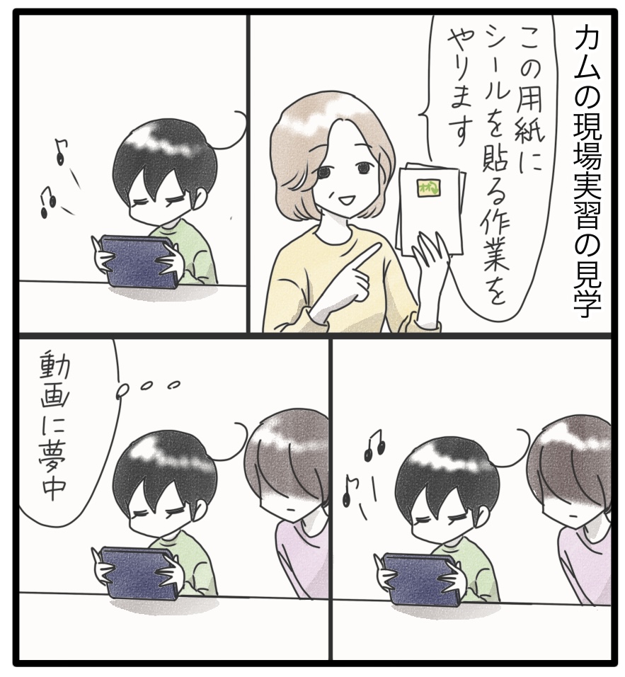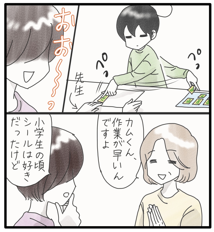 ドキドキ☆カムの現場実習 4 2024年08月05日 続く…カムは小さい頃からシールが大好きで、主にペタペタ粘着の感触を楽しんでいました。だけど、シールを貼るとなると、なかなか…小学生の頃、いっぱい練習したのですが一枚貼るのに時間がかかりました。月日は経ち、いつのまにか上手に貼れるようになっていました。素晴らしい!だけどカムのすごいところがまだあるらしいよ!次回に続く▼続きを読む▼ ▼シール大好きなご幼少のカムのお話▼ ▽最初から読む▽ ***** 「日常」カテゴリの最新記事 タグ :#漫画#育児漫画#コミックエッセイ#障害児育児#発達障害#知的障害#聴覚障害#現場実習 < 前の記事次の記事 > コメント コメント一覧 (7) 1. さーちゃん 2024年08月06日 15:22 こんにちは👋😃シール貼り、上手ですよね🎵 0 しおり がしました 4. Shiori 2024年08月08日 10:20 >>1 シール貼り、得意のようです。 0 しおり がしました 2. サスケ 2024年08月07日 15:42 かむくんのすごいところ!現場実習で開花ですか⁉︎楽しみです! 0 しおり がしました 5. Shiori 2024年08月08日 10:22 >>2 環境が変わると新しい発見がありますね。カムちゃんのすごいところ発見です! 0 しおり がしました 3. なかちゃん 2024年08月07日 19:59 続きが気になる〜🥹✨✨ 0 しおり がしました 6. Shiori 2024年08月08日 10:23 >>3 😁カムが特技を披露したようです。詳しくは続きを読んでね! 0 しおり がしました 7. さーちゃん 2024年08月14日 14:58 カムくんシール貼り上手いから、スーパーのシール貼りとかどうですかね。 0 しおり がしました このブログにコメントするにはログインが必要です。 さんログアウト この記事には許可ユーザしかコメントができません。 コメントフォーム 名前 コメント 記事の評価 リセット リセット 顔 星 情報を記憶 コメントを投稿する