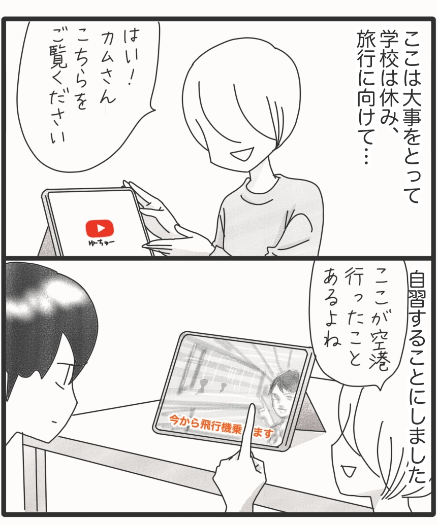 食事完全拒否していたカムが外食できるようになるまで*13 2025年08月31日 びっくりするくらい元気に。まるで旅行に間に合わせたかのよう。さすが!本番に強いカム!そうは言ってもこれから体調崩すこともあるかもしれないし他の子にうつしても怖いので、旅行当日まで休むことにして、その間、動画にて飛行機に乗る勉強をすることにしました。ゆりちゃんや実家にもカムが元気になったよの連絡。良い流れ!このまま上手く行きますように次回に続く▼続きを読む▼ ▽最初から読む▽ ▼Instagramもよろしくね▼*フォローよろしくお願いします***** 「漫画」カテゴリの最新記事 タグ :#漫画#育児漫画#コミックエッセイ#障害児育児#発達障害#知的障害#聴覚障害 < 前の記事次の記事 >
