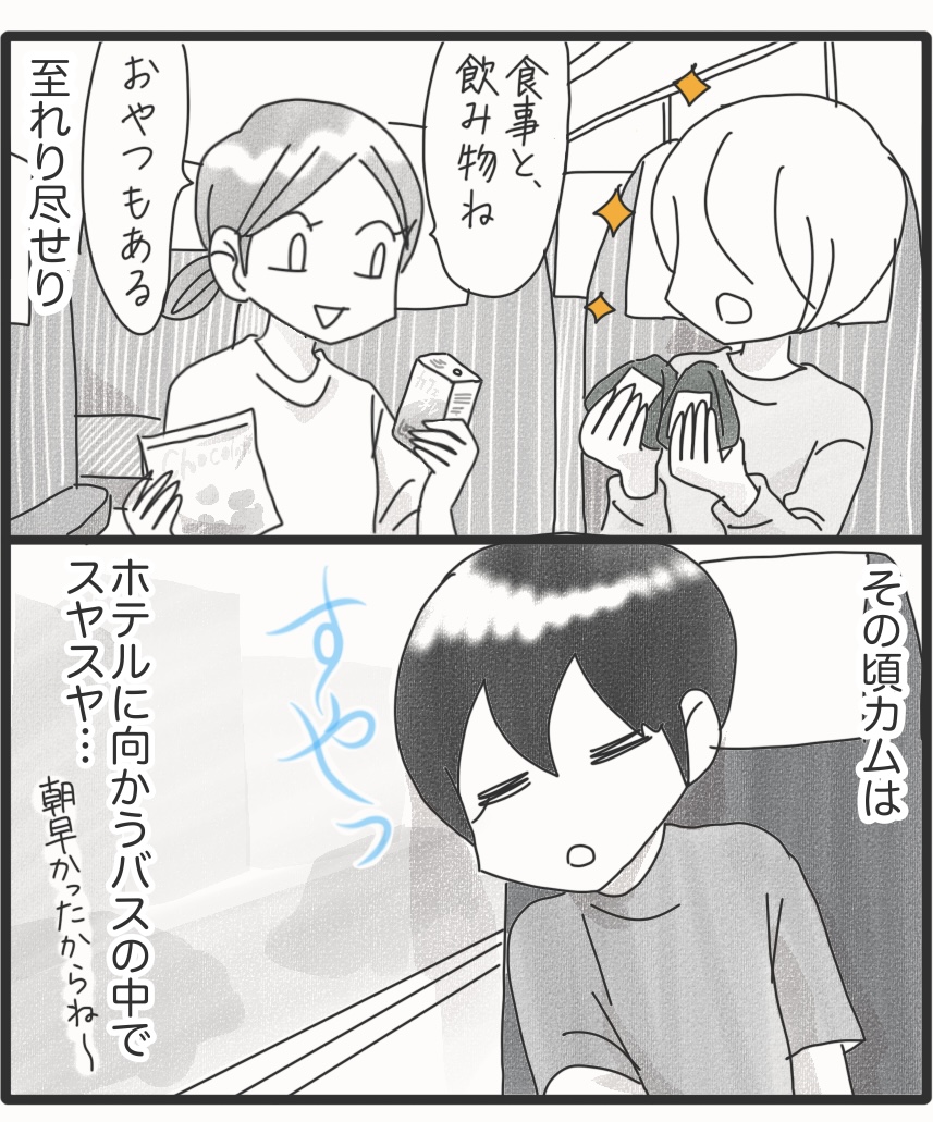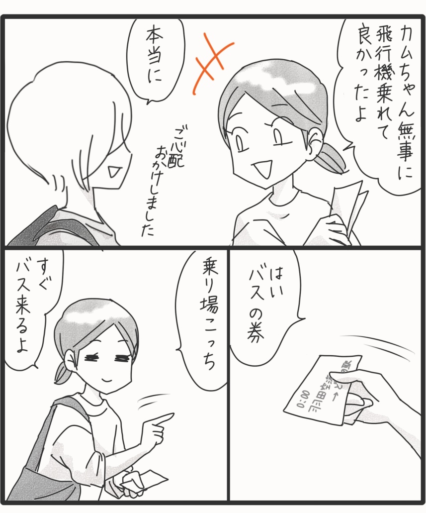 食事完全拒否していたカムが外食できるようになるまで*17 2025年09月17日 飛行機を降りたら北海道との気温差に驚いたよ。暑いだろうと思ったけど本当に暑かった。カムもぐずることなく順調でヨロシイ⭐︎空港では、先に到着したゆりちゃんが待っていて、バスの券やら食事やら飲み物やら買っておいてくれました。バスはね、私たちの他は1名しか乗ってなくてほぼ貸切状態。気兼ねなくキャッキャしながら目的地に向かうつもりでした。次回に続く▼続きを読む▼ ▽最初から読む▽ ▼Instagramもよろしくね▼*フォローよろしくお願いします***** 「漫画」カテゴリの最新記事 タグ :#漫画#育児漫画#コミックエッセイ#障害児育児#発達障害#知的障害#聴覚障害 < 前の記事次の記事 >
