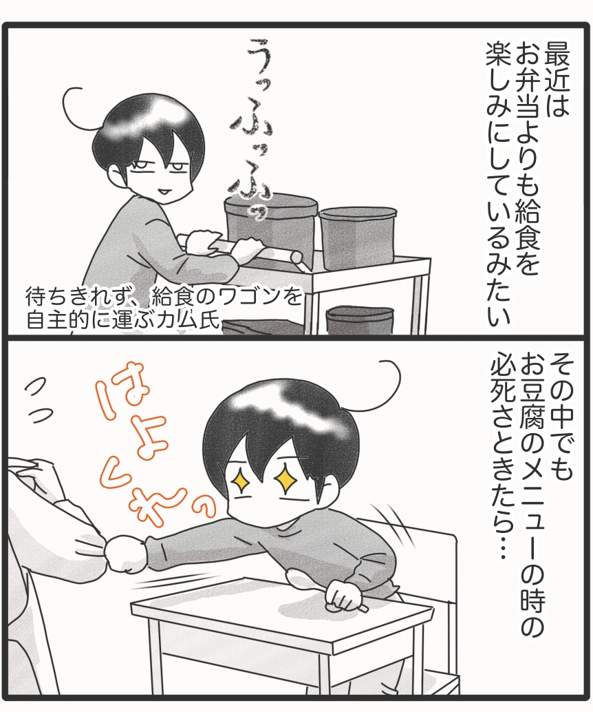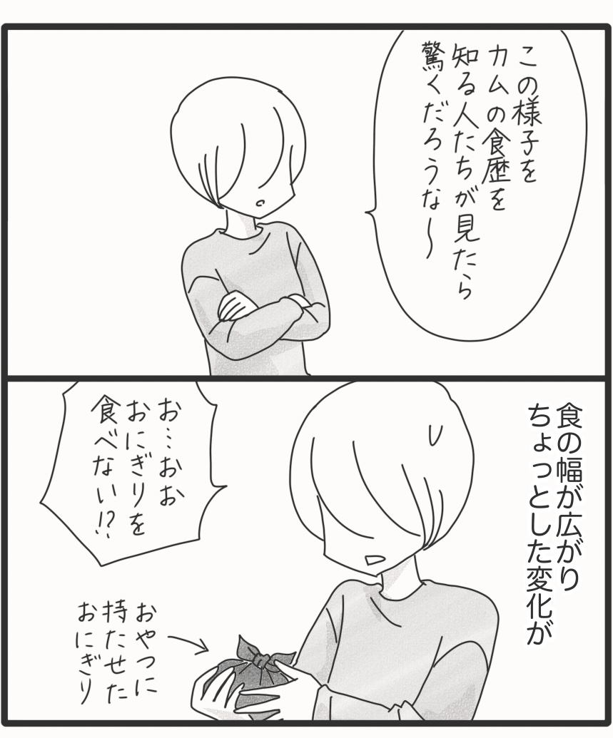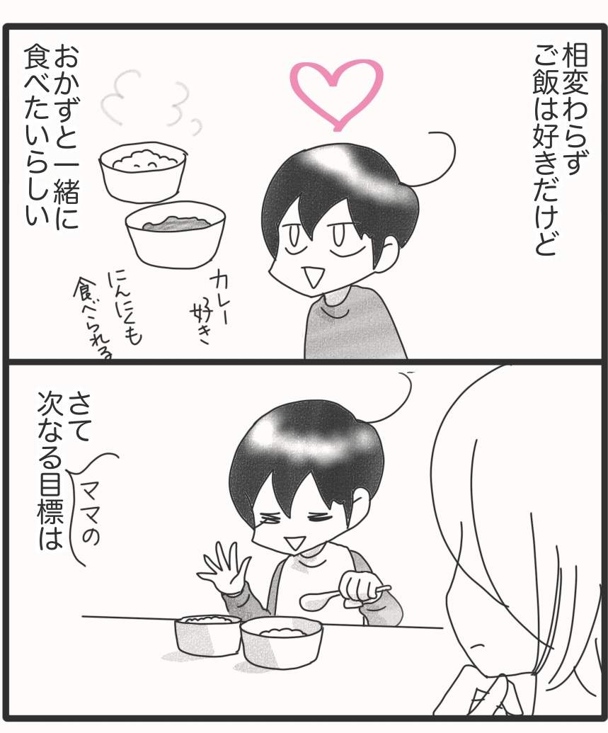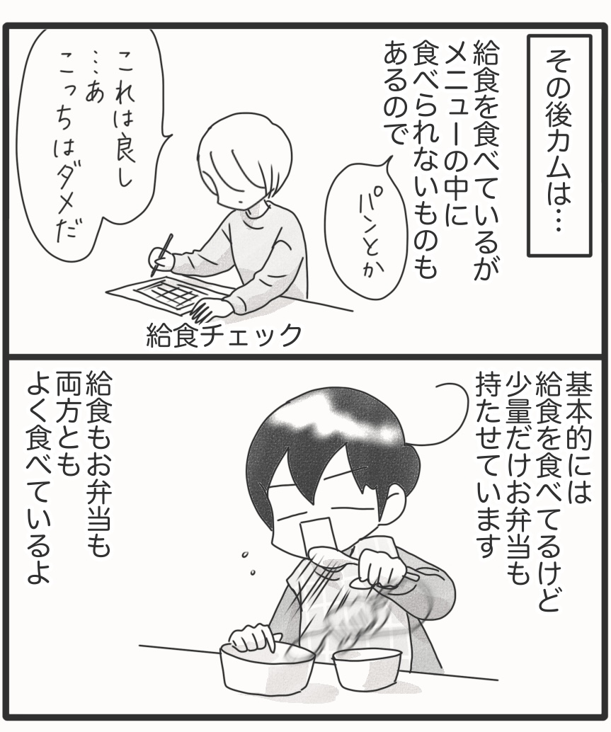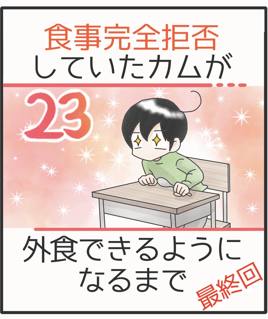 食事完全拒否していたカムが外食できるようになるまで*最終回 2025年10月11日 カムが給食を楽しみにする姿を見れるとは。驚きです。カムはこだわりのほかに感覚過敏もあるので、まだ咀嚼できず、食べられない食材はありますが、これだけ色々食べられるのであればできることが増えてきます。長い時間をかけて食べることが大嫌いだったカムが外食できるまでになりましたが、もっと簡単な道があったのかどうなのか?このやり方が他の方にも効果あるのか?よくわかりませんがカムにとっては良いテンポだったんじゃないかなと思っています。この連載、『おにぎり好きになるまで』のシリーズと合わせると、79話という長いお話になってしまいました。ここまで読んでくれた皆さま。ありがとうございます。カムの食に関してはまだ課題はあるので、これからも試行錯誤していくつもりです。これからも見守ってください~。次回からはいつもの日常漫画です。▽最初から読む▽ ▼Instagramもよろしくね▼*フォローよろしくお願いします***** 「漫画」カテゴリの最新記事 タグ :#漫画#育児漫画#コミックエッセイ#障害児育児#発達障害#知的障害#聴覚障害 < 前の記事次の記事 >