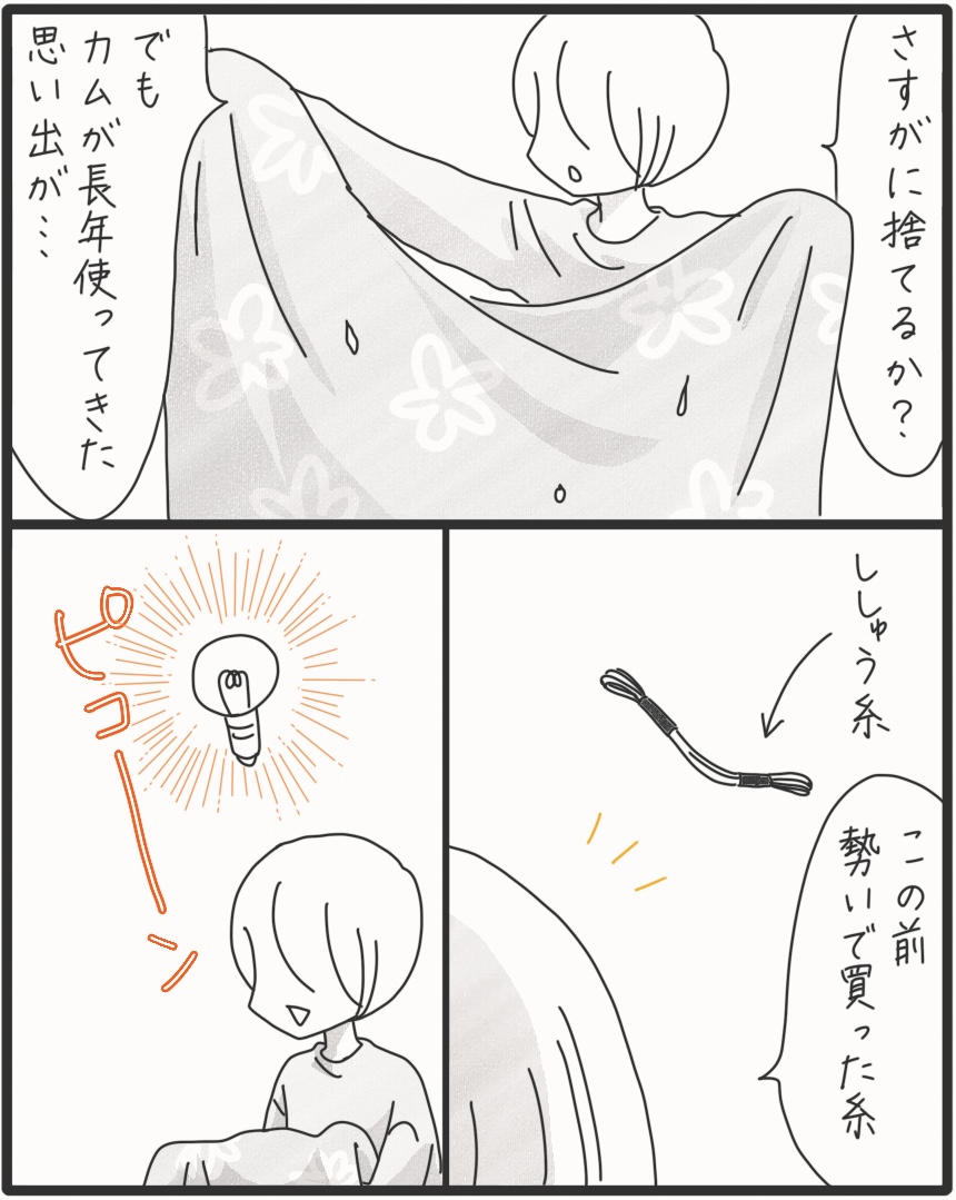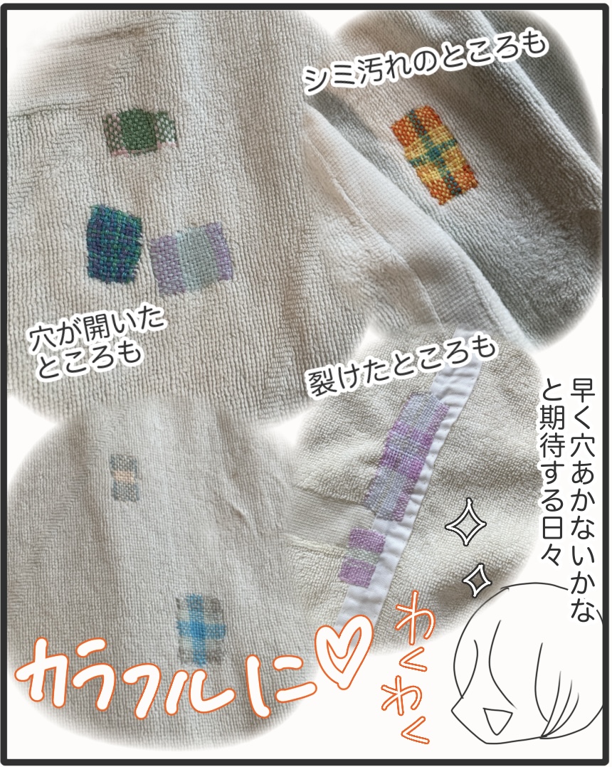 発熱するカムとカラフルになっていくタオルケット 2025年10月28日 楽しくなってきちゃって刺繍糸買い足し。今もなお、カラフルになっていってます。古いものを直しつつ使い続けるって良いね。カムはね、さすが若いもんで復活早かった~!▼Instagramもよろしくね▼*フォローよろしくお願いします***** 「漫画」カテゴリの最新記事 タグ :#漫画#育児漫画#コミックエッセイ#障害児育児#発達障害#知的障害#聴覚障害 < 前の記事次の記事 >