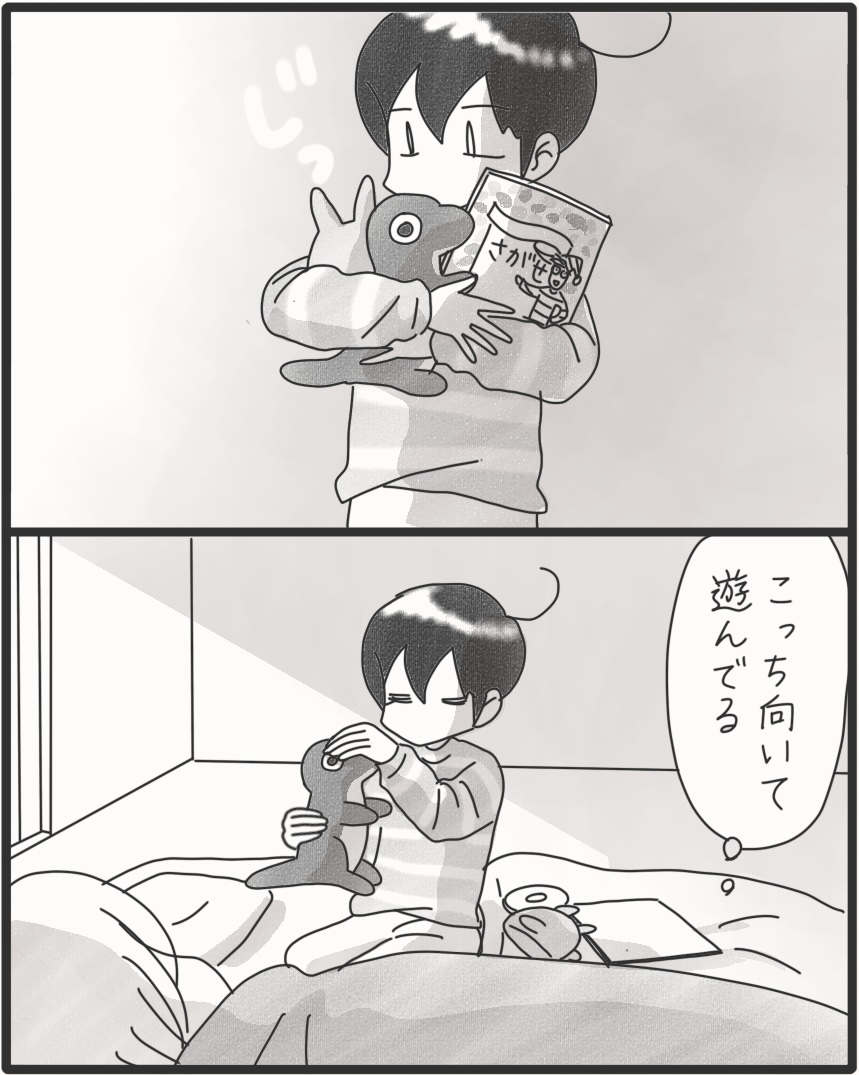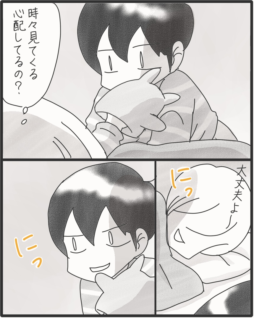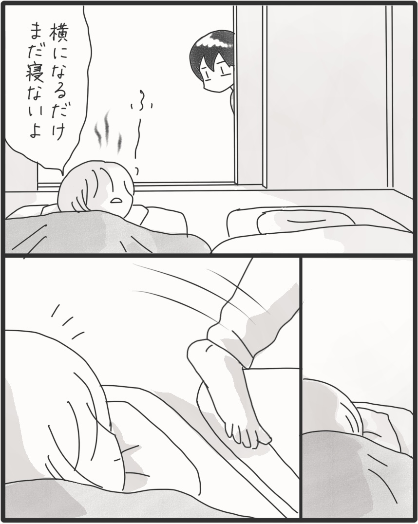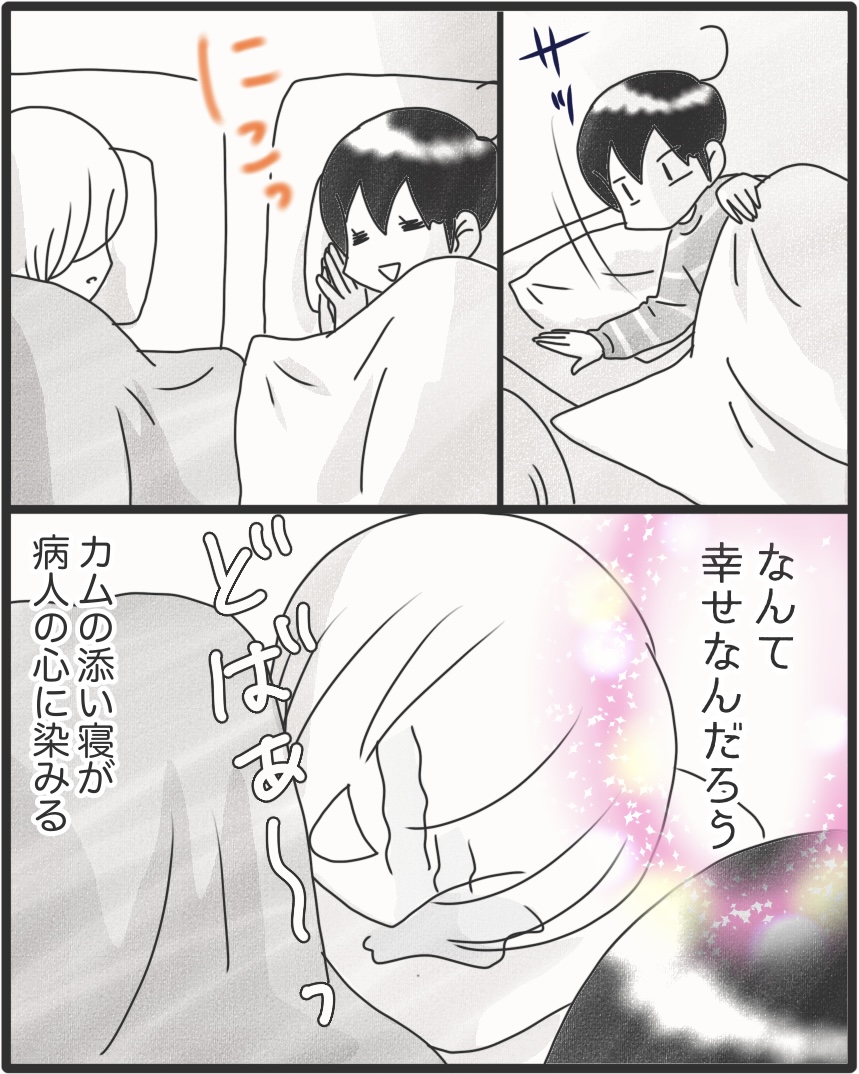 カムの風邪が移りまして… 2025年11月09日 何を思ってかカムも布団に入ってにっこり。頭痛いし寒気するししんどかったけど、心はポカポカ。そういえばカムが小さい頃高速トントンで雑な寝かしつけされてたな~w 高速トントンも良かったけど、笑い合いながら布団に入るなんて。寝かしつけも進化してる。▼Instagramもよろしくね▼*フォローよろしくお願いします***** 「漫画」カテゴリの最新記事 タグ :#漫画#育児漫画#コミックエッセイ#障害児育児#発達障害#知的障害#聴覚障害 < 前の記事次の記事 >