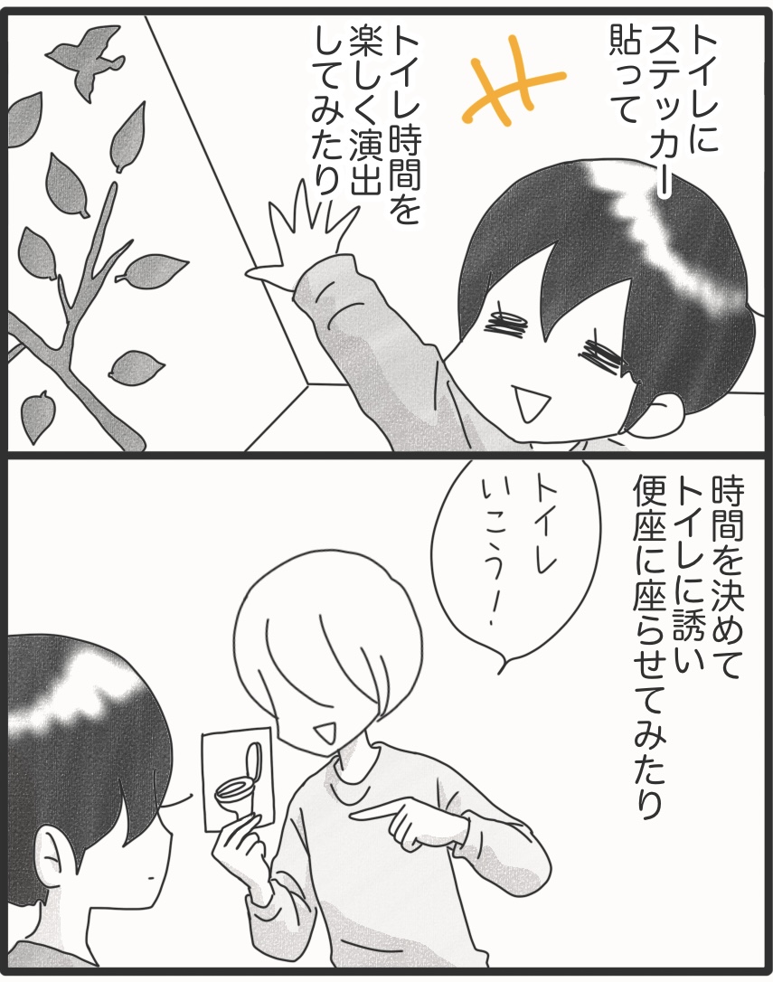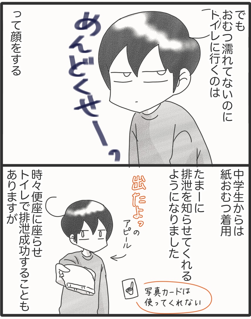 カムのトイトレ、どうしたらいいの⁉︎ 2025年11月25日 たまにトイレで排泄成功することもあるけどまだまだレアケースで、おむつで排泄したことをお知らせするのですらたまーに、です。時間を決めてトイレに誘って便座に座らせていましたが、カムの拒否が激しく、なかなか続けられず。トイレで排泄できるようになるのが目標でトイトレを続けていたのですが最近は停滞している感じなのです。待つことも大事。停滞しているように感じるけれどカムの中で静けに変化しているのを信じて待つべきか?新たなアプローチが必要なのか?どうしたらいいの~▼Instagramもよろしくね▼*フォローよろしくお願いします***** 「漫画」カテゴリの最新記事 タグ :#漫画#育児漫画#コミックエッセイ#障害児育児#発達障害#知的障害#聴覚障害 < 前の記事次の記事 > コメント このブログにコメントするにはログインが必要です。 さんログアウト この記事には許可ユーザしかコメントができません。 コメントフォーム 名前 コメント 記事の評価 リセット リセット 顔 星 情報を記憶 コメントを投稿する
