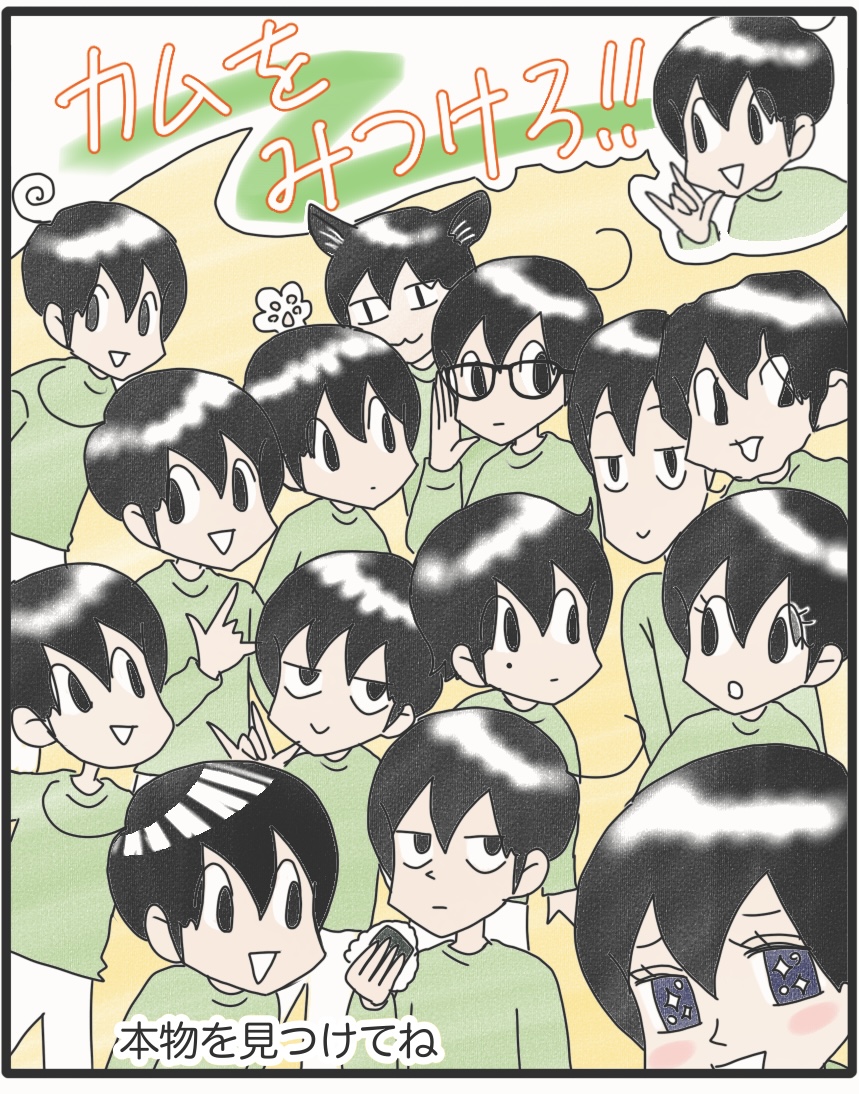 カムがたくさんいる! 2025年12月11日 カムの大好きな人を探す絵本を一緒に見て寝た夜。漫画のカムがたくさん現れる夢を見ました。よく見るとみんなちょっと違う。本物を見つけろ!な夢でした。本物、見つけられましたか?答えはこちら↓↓↓↓↓↓この偽物カムの中に左手で描いた力作カムもいるんですけどわかりますか?偽物カムも可愛いな▼Instagramもよろしくね▼*フォローよろしくお願いします***** 「漫画」カテゴリの最新記事 タグ :#漫画#育児漫画#コミックエッセイ#障害児育児#発達障害#知的障害#聴覚障害 < 前の記事次の記事 >