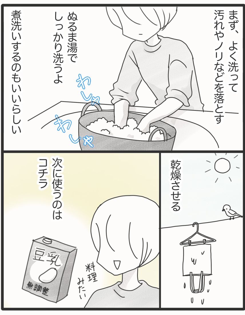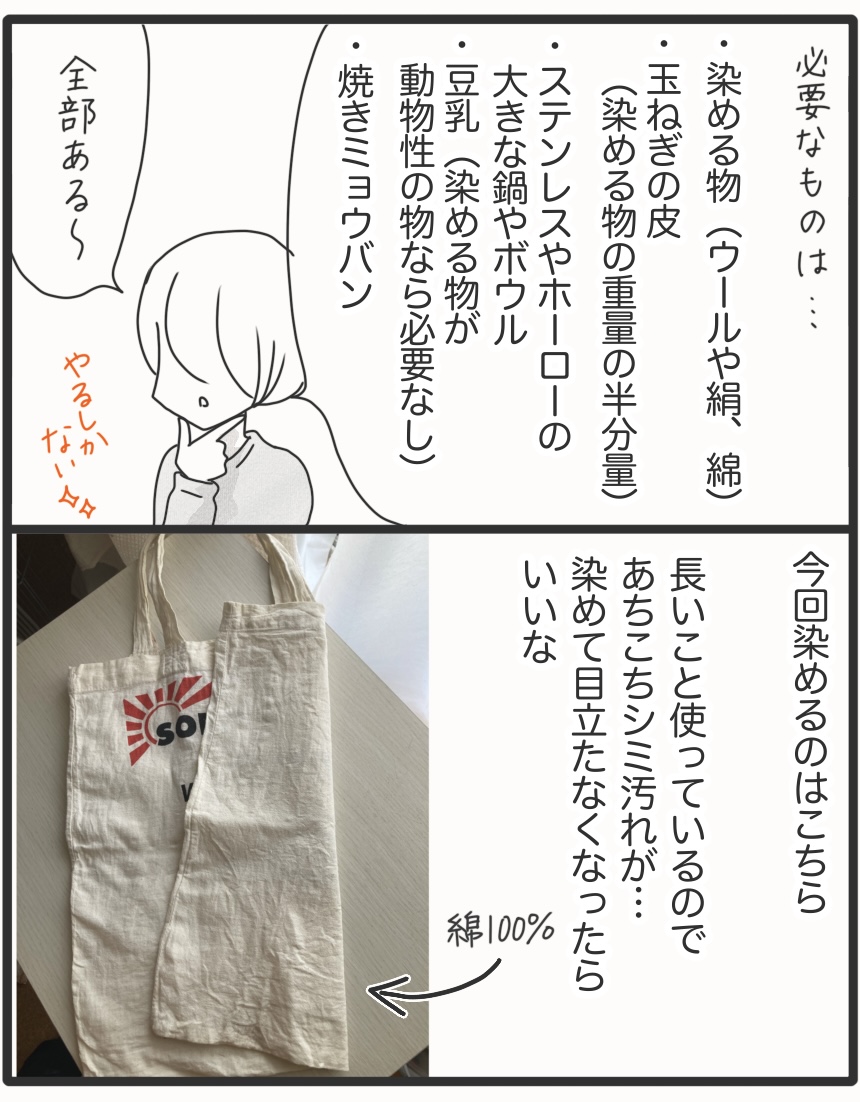 玉ねぎの皮で染めてみよう*前編 2025年12月14日 玉ねぎの皮ってキレイ確か…お茶にできるんじゃなかったっけ?そう思って捨てずに取っておいたのですが調べてみたら染め物に使えるそうで。面白そうなのでさっそくやってみました。やり方は色々あるようです。今回は私がやった方法を紹介します。今回染めるバッグは80gでした。玉ねぎの皮は45g結構たくさんの皮を集めたつもりだったけどこれでも45gかぁ。皮を集めるの時間かかります💦後編に続く ▼Instagramもよろしくね▼*フォローよろしくお願いします***** 「漫画」カテゴリの最新記事 タグ :#漫画#育児漫画#コミックエッセイ#障害児育児#発達障害#知的障害#聴覚障害 < 前の記事次の記事 >