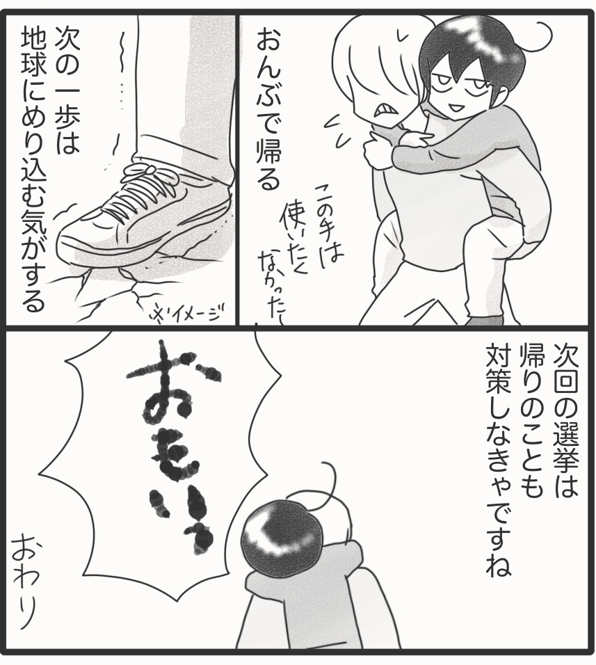 カムが初の投票に挑んだ話 8 2025年06月26日 体育館がよっぽど興味深いのか帰ろうとしないカム。何とか外へ出たものの、もっと遊びたかったというアピールで座り込み。そうこうしているうちに人がどんどん増えてきて、通行人の妨げに。仕方ないので最後の手段、おんぶで帰路につきました。重いのなんのって。地面にめり込むかと思ったよ。次回は帰りのことも考えなきゃな。次回は選挙に関するおまけやお得情報を投稿します。▼続きを読む▼ ▽最初から読む▽ ▼Instagramもよろしくね▼*フォローよろしくお願いします***** 「漫画」カテゴリの最新記事 タグ :#漫画#育児漫画#コミックエッセイ#障害児育児#発達障害#知的障害#聴覚障害#選挙#投票 < 前の記事次の記事 > コメント コメント一覧 (3) 1. チアキ 2025年06月26日 20:32 カムくん、ママさんお疲れ様でした!レポートありがとうございます うちも選挙に連れていきますが、全然ちゃんとしてなくて… 係員に頼むこともせず、普通に2人で記入台に横並び、 息子は思いっきり、私の書いたのをカンニングして記入します… (今のところ、選挙違反とは言われてません💦) 0 しおり がしました 3. やっちゃん 2025年06月27日 16:27 帰りのおんぶは大変(✘д✘๑;) ³₃ カム君の学校には体育館はないのかな? 初めて見る場所だって感じがしたので💦👀 0 しおり がしました 4. コロネル 2025年06月27日 20:06 投票お疲れ様でした。 ところで、コメントを承認制にした方がいいですよ。 0 しおり がしました このブログにコメントするにはログインが必要です。 さんログアウト この記事には許可ユーザしかコメントができません。 コメントフォーム 名前 コメント 記事の評価 リセット リセット 顔 星 情報を記憶 コメントを投稿する