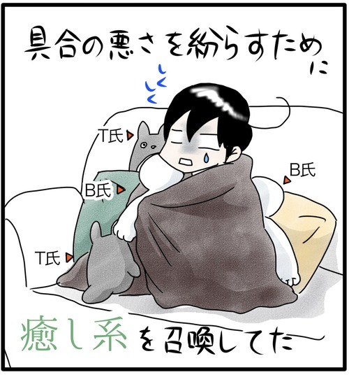 【絵日記】風邪っぴきその後 今はもう元気になりましたが少し前に体調を崩したカム。発熱なしで食欲あり。そんなに重い感じではありませんが、いつものように元気に動けず涙目。気がつくとカムはT氏とB氏を召喚していました。どうやったら元気出るかな?って自分で考えて対策したんだね。すごい! ** ... 続きを読む 2024年02月22日