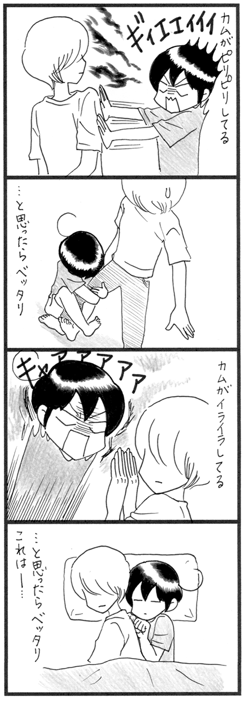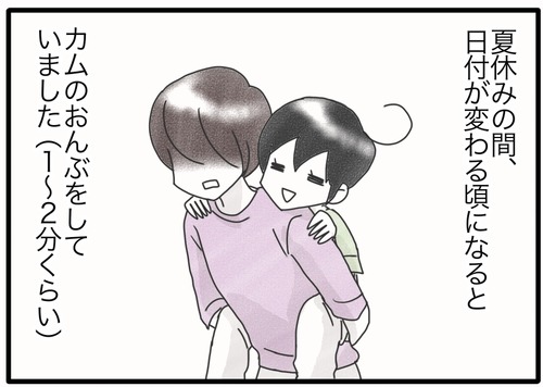誘ってちょうだい 夏の真夜中。なぜなのか毎日カムをおんぶしていました。カムがおんぶする?って誘って!と要求してくるのです。仕方なく誘うと、嬉しそうに背中に飛びついてきます。このシステム、何だろうな~。自分からおんぶ要求するより、おんぶしようかと誘ってもらっておんぶしてもらう ... 続きを読む 2024年09月02日