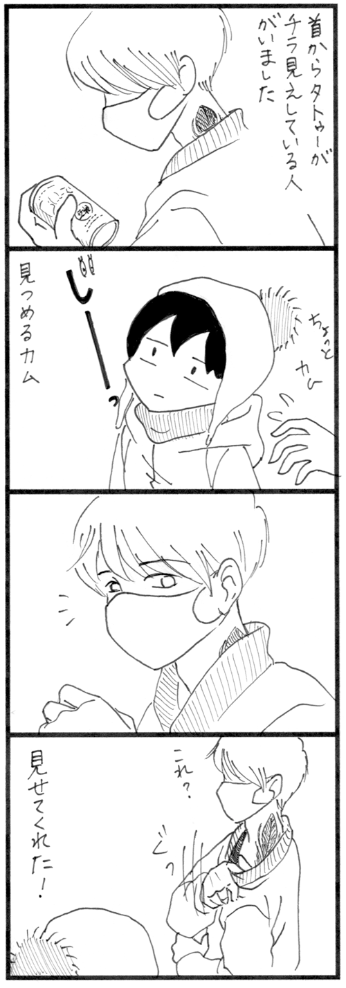 じーーーーー このお話は去年の出来事。引越しでドタバタしていて、漫画にするのを忘れていました〜!以前住んでいた家の近くのコンビニ。ここではたくさんの素敵な人(知らない人)に出会えました。このお兄さんもその一人。じっと首元を凝視するカムに黙ってタトゥを見せてくれました。 ... 続きを読む 2021年03月03日