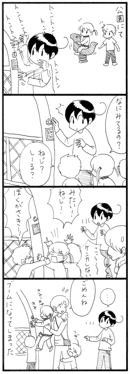 ブームな男 (マスクは省略して描いています)カムと公園に。カムは遊具のポールをトントンしながらネジを見て遊んでいました。すると、カムの様子に気がついたちびっこが近寄ってきてカムが見ているものに興味津々。そのうち他のちびっこも集まり、私も見たい!と大騒ぎに。こんな時カ ... 続きを読む 2020年10月01日