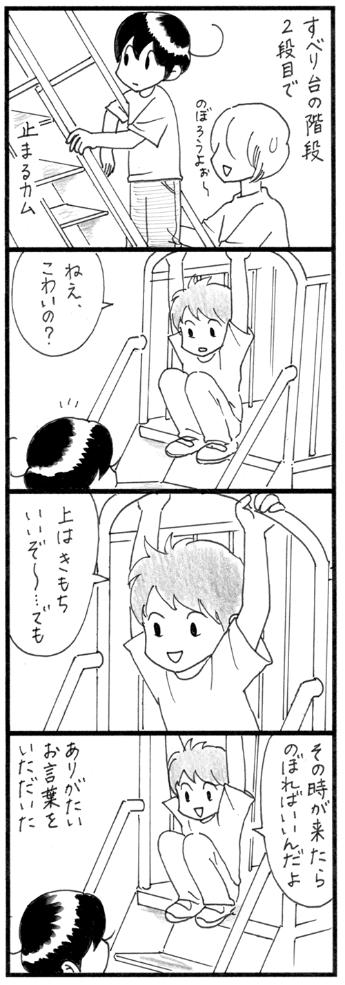 滑り台チャレンジ 'デイサービスのお友達が一緒なら滑り台を滑れるようだけど、一人ではまだ怖いみたい。階段で躊躇するカムに滑り台のベテランがアドバイス。多分、小学1〜2年生くらい?公園で出会う、遊びの先輩(子供)たち。彼らも怖かったり苦手だったりしたものを徐々に克服していっ ... 続きを読む 2021年06月25日
