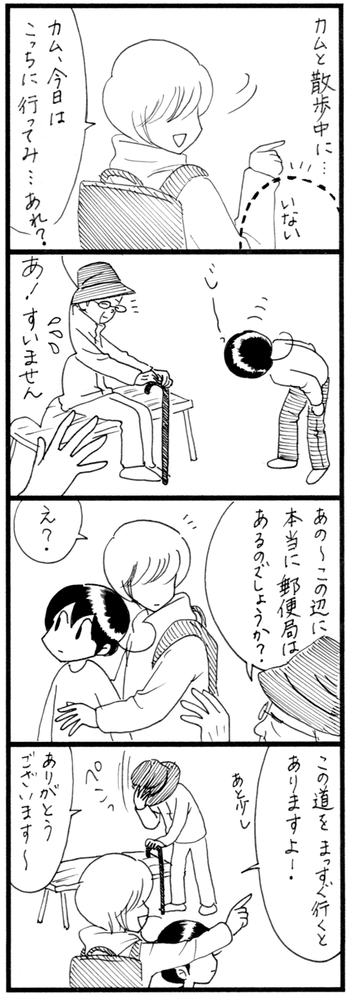 困ってるおじいさん ※マスクは省略して描いております。バス停のベンチに座っていたおじいさん。なぜかこのおじいさんをじーっと見つめ気にするカム。てっきりバスを待ってるのかと思ったら、郵便局を探し求めて歩き疲れ、休憩していたそうです。(誰かにこの先に郵便局があるって聞いてきたらし ... 続きを読む 2020年11月13日