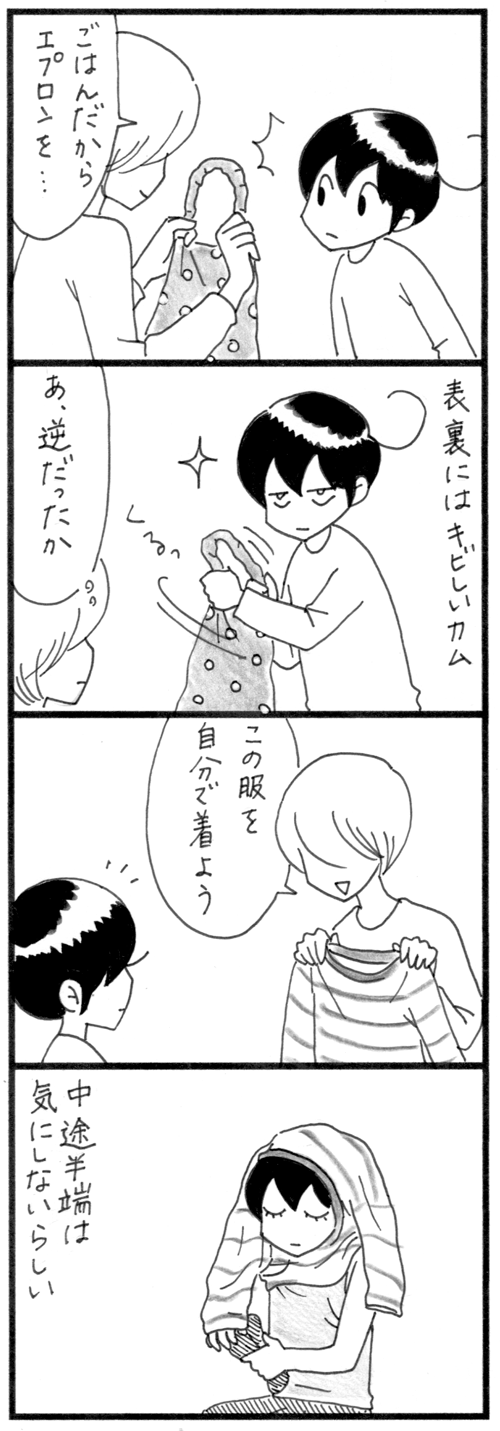気にしない このエプロン、私が作ったエプロンなんだけど表裏が本当にわかりにくい。でもカムは一瞬で見分けます!素敵〜〜〜!エプロンの表裏にはすごく厳しいカムだけど中途半端なのは気にならないらしい。着替えが中途半端な状態で平気で遊んでいます。ちゃんと着た方が絶対楽に遊べ ... 続きを読む 2021年05月19日