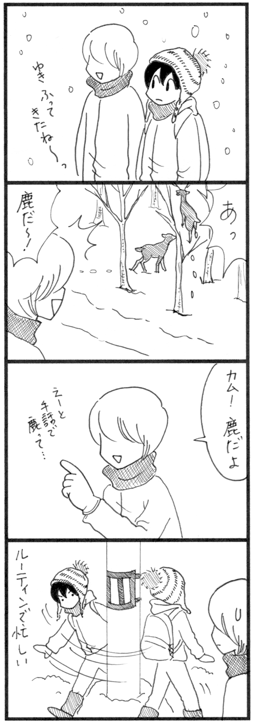 カム、見て見て! カムあるあるの一つ。『見て欲しいところを見てくれない』時々、家の近所で鹿を見かけます。立派な体つきで、寒いのに悠々と歩き、何やらもぐもぐしつつ歩いています。そんな鹿を見て欲しくてカムに見て見てアピールするけれど、カムは電信柱の周りを回る方が心躍るようで、 ... 続きを読む 2021年02月19日