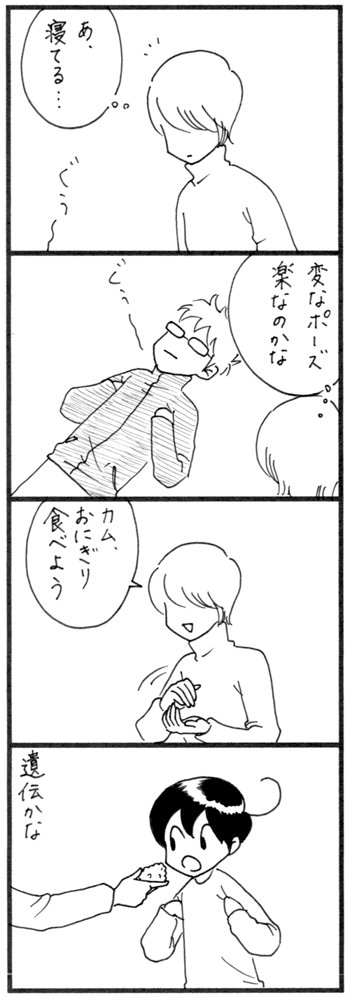 遺伝??その2 前回に引き続き、変なところが似ちゃったシリーズ、パパ編夫は寝るときに両手を脇に挟んで寝る。落ち着くんでしょうね〜私にはわかりませんが。最近になってカムがおやつのおにぎりを食べるときに両手を脇に挟むようになりました。いつもは、おにぎりを食べながら、(私が食 ... 続きを読む 2020年04月28日