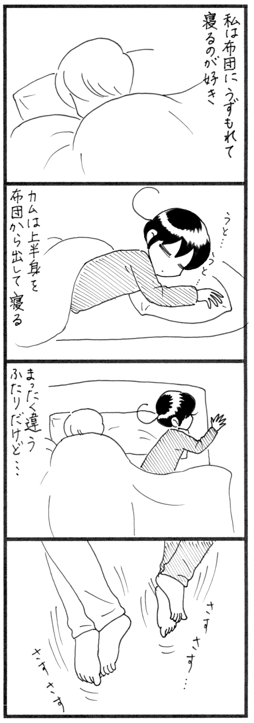 遺伝?その1 真冬でも カムは上半身に布団をかけずに寝るスタイル。 真夏でも 私は、顔まで布団をかけたいタイプ。 相反する二人ですが、 布団に入ると、 足の甲をもう一方の足でさすりながら寝るのは一緒。 遺伝かしらね?***** ... 続きを読む 2020年04月25日