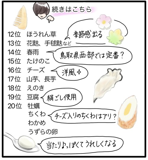 【ブログ限定】おすすめ!茶碗蒸しの具*2 ランキングの続き~!チーズを入れるときは、ブロッコリーやトマトを入れると良さそうですね。先日、さつまいもを入れてみたのですが、甘くて美味しかったです♪白子~美味しそう!トリュフ⭐︎手に入ったらチャレンジしてみる!舞茸は、茶碗蒸しが固まりにくくなる事があるよ ... 続きを読む 2023年01月30日