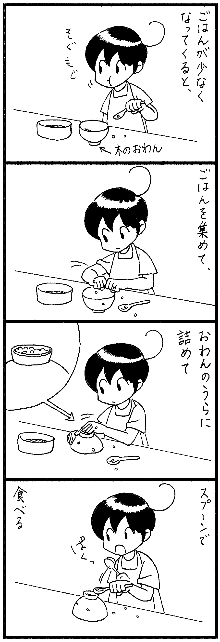 ご飯が少なくなったら 2コマ目でご飯を手で握るなら そのまま食べちゃったらどうかなと思うけど、 カムはとにかくスプーンで食べる派。 カムはご飯を食べるときには木製のおわんを使っています。 こんな食べ方だから、 裏もしっかり洗います。 ***** おまけ 寝ている間に ... 続きを読む 2018年07月01日